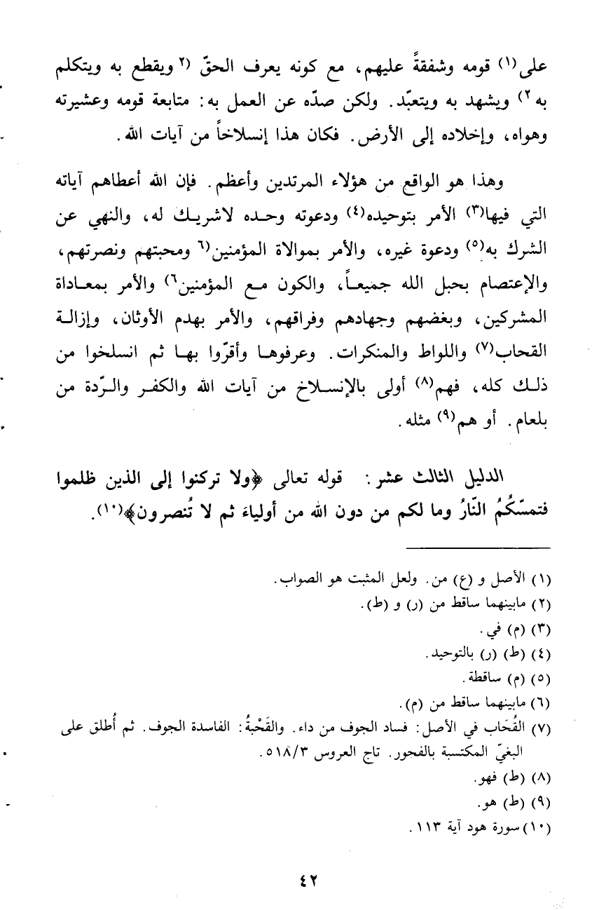 الدليل الثالث عشر: قوله تعالى: (ولا تركنوا إلى الذين ظلموا فتمسكم النار ومالكم من دون الله من أولياء ثم لا تنصرون) (¬10) .