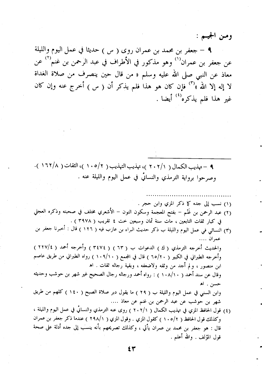 9 - جعفر بْنُ مُحَمَّدِ بْنِ عِمْرَانَ رَوَى (س) حَدِيثًا فِي عَمَلِ الْيَوْمِ وَاللَّيْلَةِ عَنْ جَعْفَرِ بْنِ عِمْرَانَ وَهُوَ مَذْكُورٌ فِي الْأَطْرَافِ فِي عَبْدِ الرَّحْمَنِ بْنِ غُنْمٍ عَنْ مُعَاذٍ عَنِ النَّبِيِّ صَلَّى اللَّهُ عَلَيهِ وَسَلَّمَ مَنْ قَالَ حِينَ يَنْصَرِفُ مِنْ صَلَاةِ الْغَدَاةِ لَا إِلَهَ إِلَّا اللَّهُ فَإِنْ كَانَ هُوَ هذا فلم يذكر أن (س) أَخْرَجَ عَنْهُ وَإِنْ كَانَ غَيْرَ هذا فلم يذكره أيضا