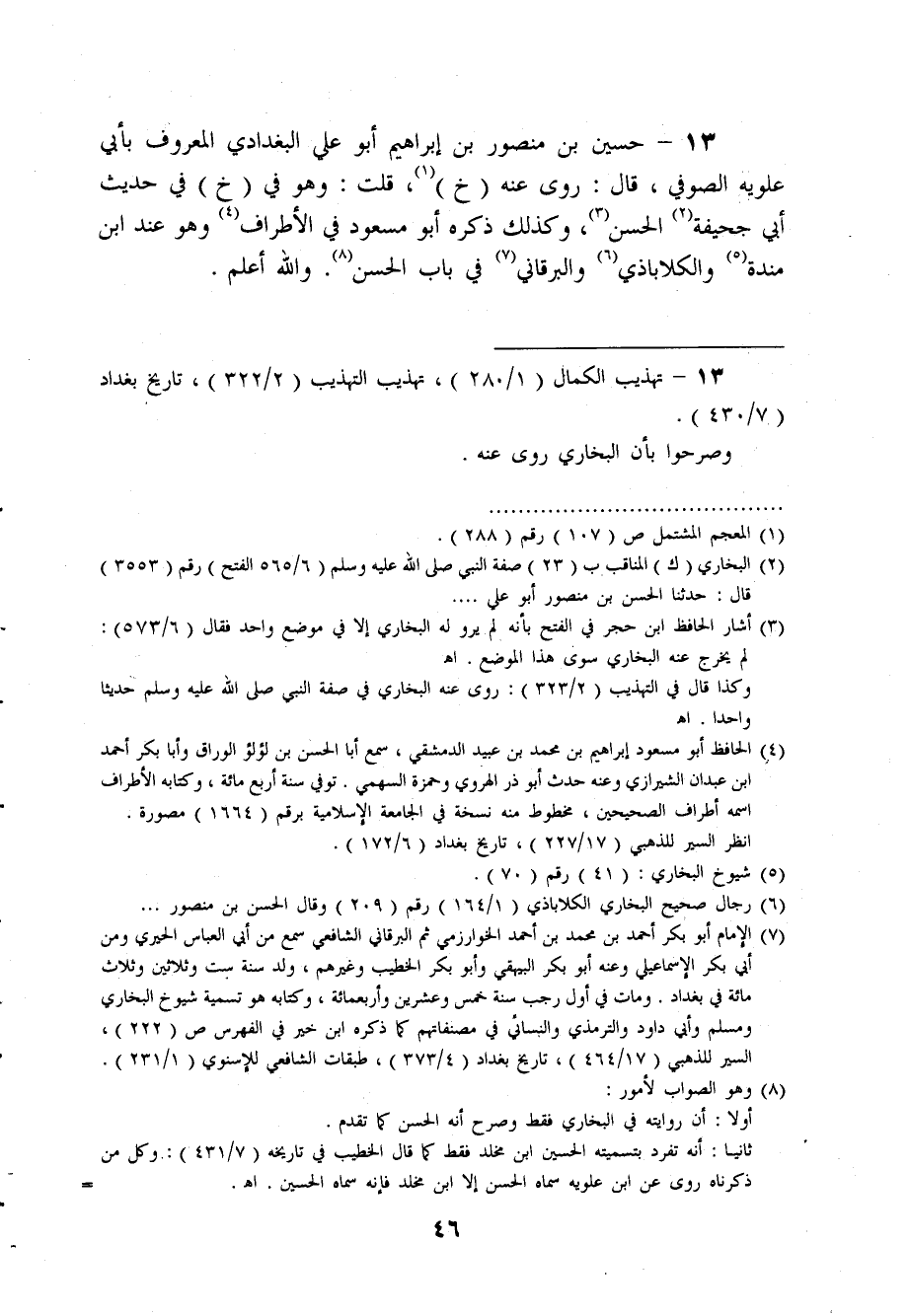 13 - حُسَيْنُ بْنُ مَنْصُورِ بْنِ إِبْرَاهِيمَ أَبُو عَلِيٍّ الْبَغْدَادِيُّ الْمَعْرُوفُ بِأَبِي علويه الصوفي قال روى روى عنه (خ) قلت وهو في (خ) فِي حَدِيثِ أَبِي جُحَيْفَةَ الْحَسَنُ وَكَذَلِكَ ذَكَرَهُ أَبُو مَسْعُودٍ فِي الْأَطْرَافِ وَهُوَ عِنْدَ ابْنِ مَنْدَهْ وَالْكَلَابَاذِيِّ وَالْبُرْقَانِيِّ فِي بَابِ الْحَسَنِ والله أعلم