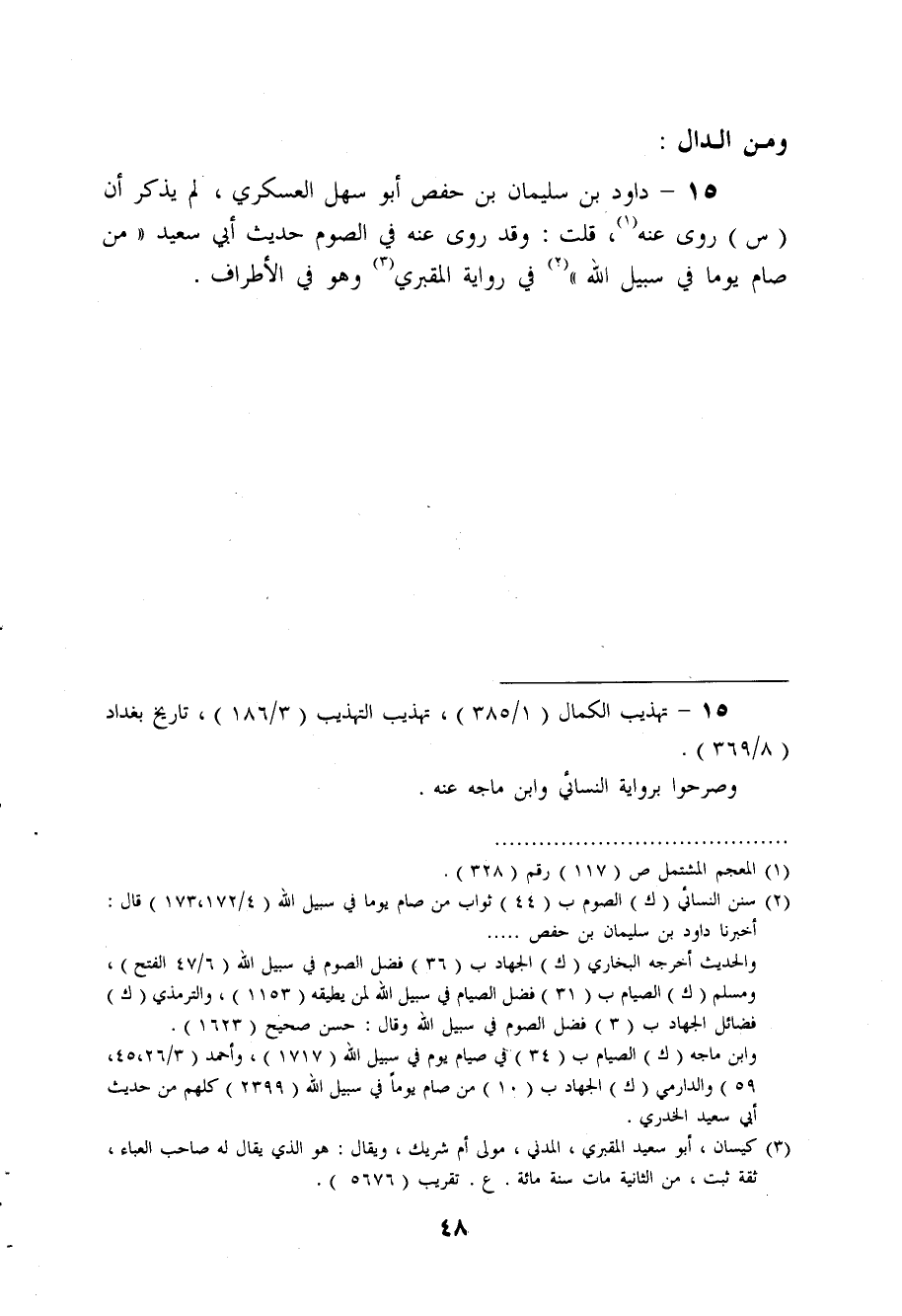 15 - داود بْنُ سُلَيْمَانَ بْنِ حَفْصٍ أَبُو سَهْلٍ الْعَسْكَرِيُّ لَمْ يَذْكُرْ أَنَّ (س) رَوَى عَنْهُ قُلْتُ وَقَدْ رَوَى عَنْهُ فِي الصَّوْمِ حَدِيثَ أَبِي سَعِيدٍ مَنْ صَامَ يَوْمًا فِي سَبِيلِ اللَّهِ فِي رِوَايَةِ الْمَقْبُرِيِّ وهو في الأطراف