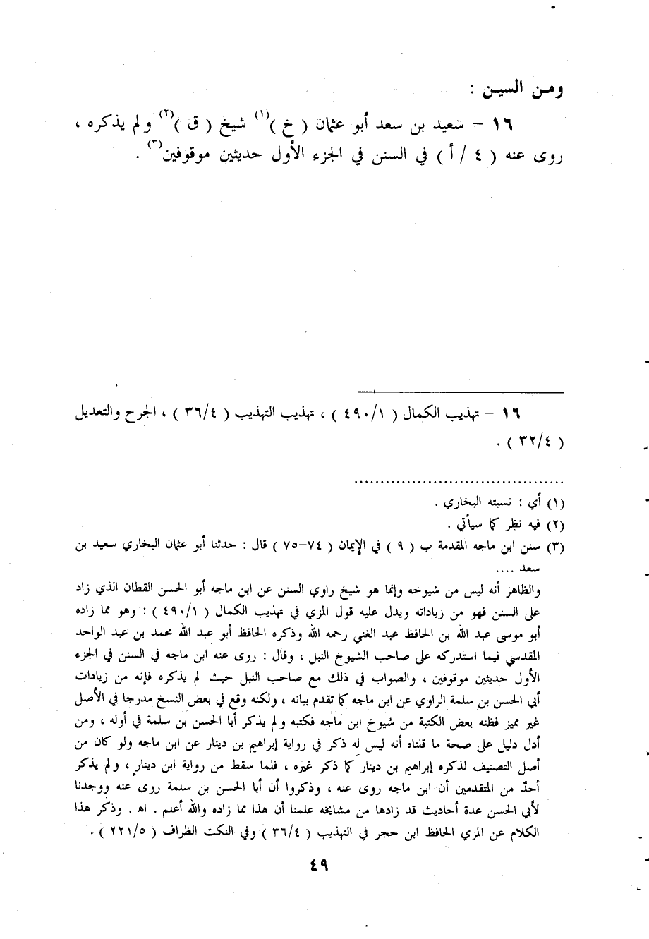 16 - سعيد بن سعد أبو عثمان (خ) شيخ (ق) ولم يذكره روى عنه (4 / أ) فِي السُّنَنِ فِي الْجُزْءِ الْأَوَّلِ حديثين موقوفين