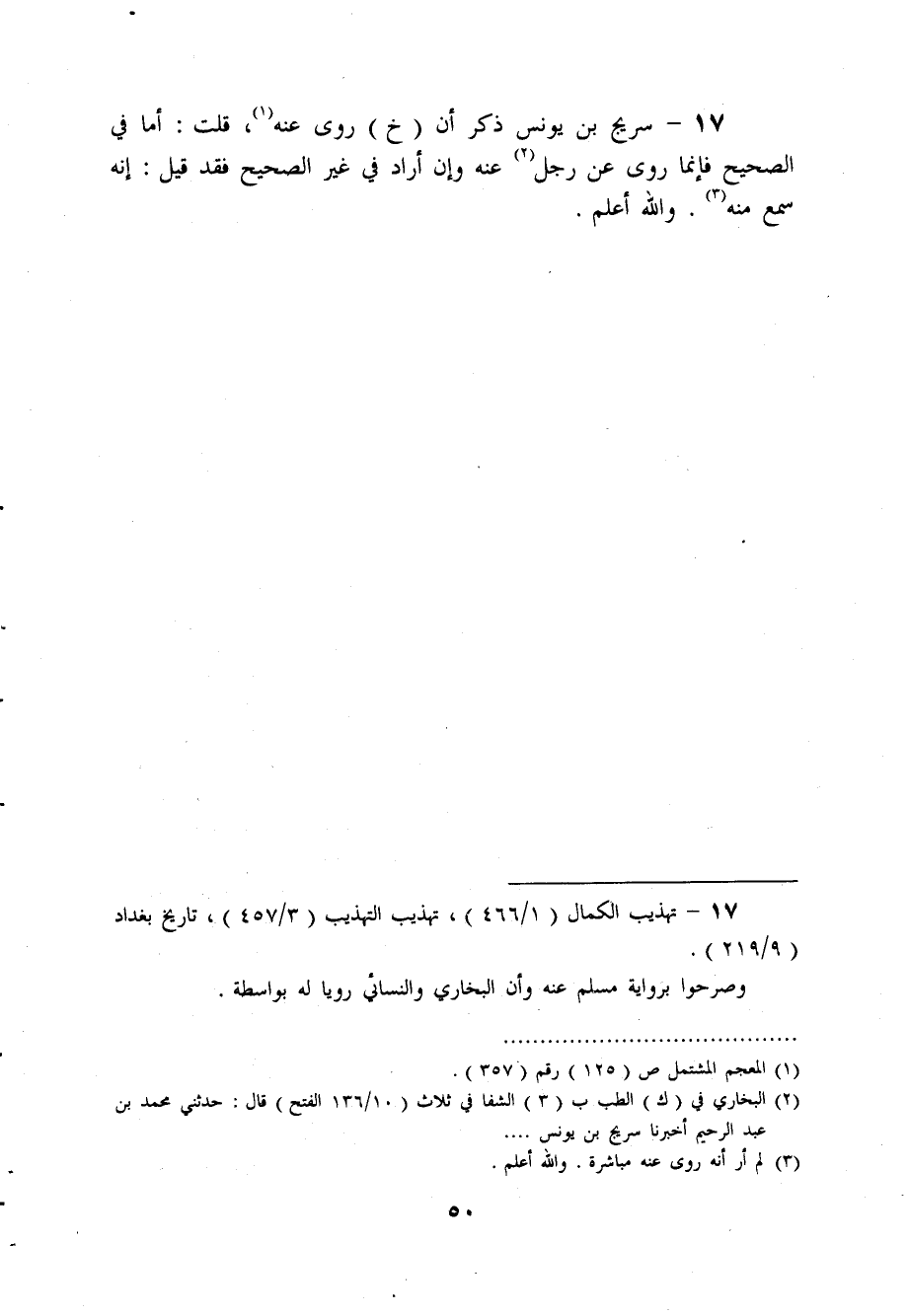 17 - سُرَيْجُ بْنُ يُونُسَ ذَكَرَ أَنَّ (خ) رَوَى عَنْهُ قُلْتُ أَمَّا فِي الصَّحِيحِ فَإِنَّمَا رَوَى عَنْ رَجُلٍ عَنْهُ وَإِنْ أَرَادَ فِي غَيْرِ الصَّحِيحِ فَقَدْ قِيلَ أَنَّهُ سَمِعَ منه والله أعلم