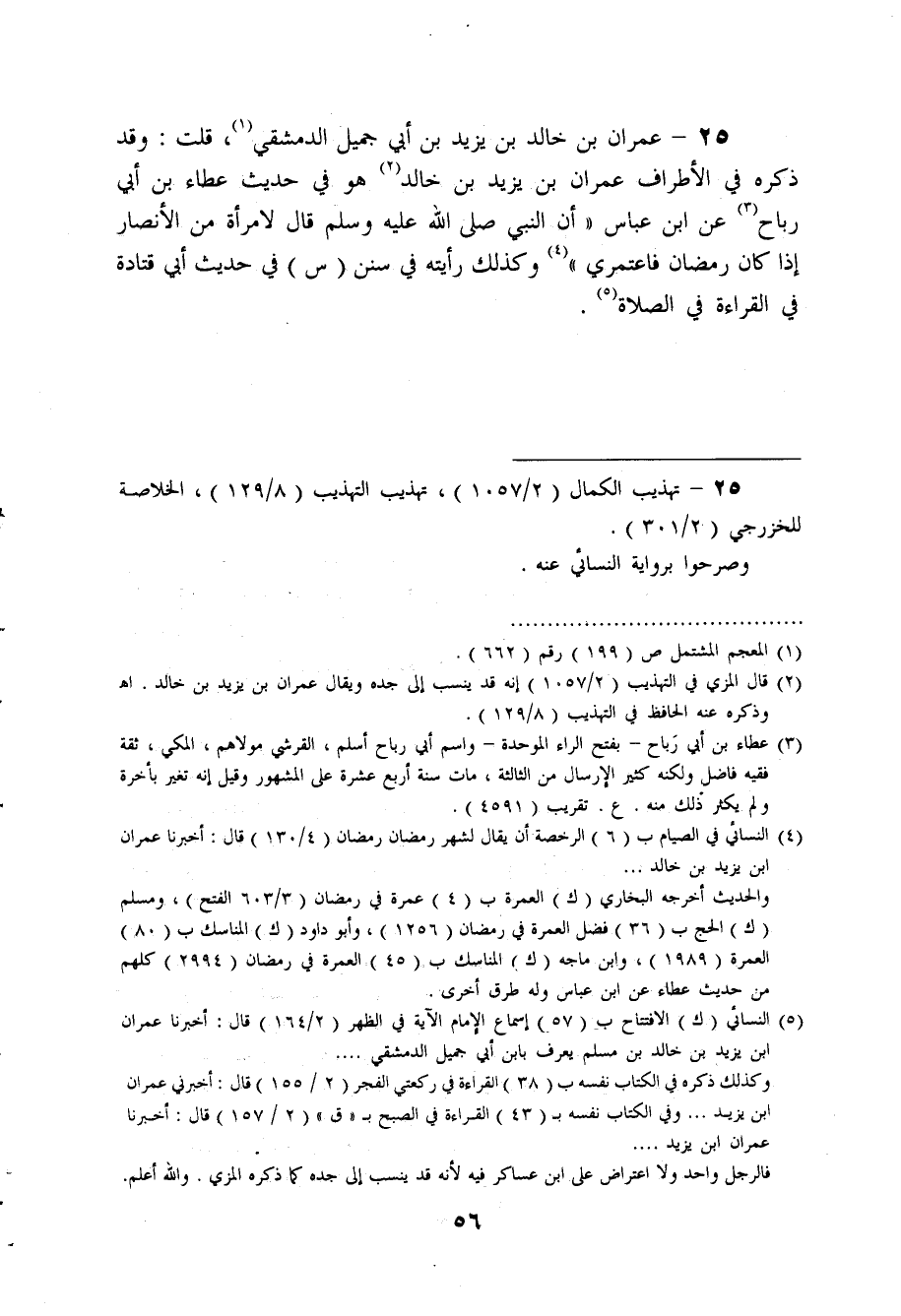 25 - عمران بْنُ خَالِدِ بْنِ يَزِيدَ بْنِ أَبِي جَمِيلٍ الدِّمَشْقِيُّ قُلْتُ وَقَدْ ذَكَرَهُ فِي الْأَطْرَافِ عِمْرَانُ بْنُ يَزِيدَ بْنِ خَالِدٍ هُوَ فِي حَدِيثِ عَطَاءِ بْنِ أَبِي رَبَاحٍ عَنِ ابْنِ عَبَّاسٍ أَنّ النَّبِيَّ صَلَّى اللَّهُ عَلَيهِ وَسَلَّمَ قَالَ لِامْرَأَةٍ مِنَ الْأَنْصَارِ إِذَا كَانَ رَمَضَانُ فَاعْتَمِرِي وَكَذَلِكَ رَأَيْتُهُ فِي سنن (س) فِي حَدِيثِ أَبِي قَتَادَةَ فِي القراءة في الصلاة