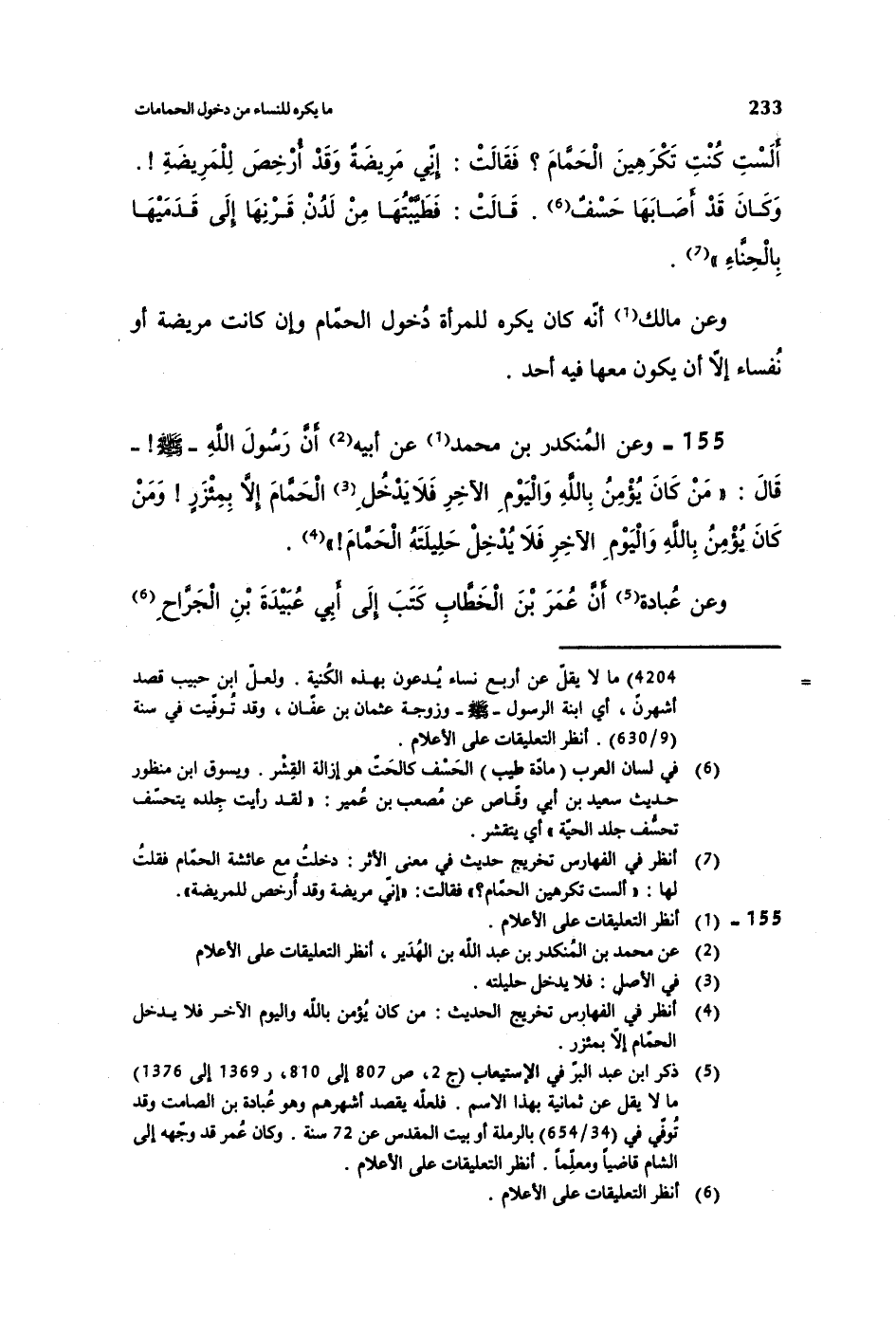 155- وعن المنكدر بن محمد عن أبيه أن رسول الله صلى الله عليه وسلم قال: ((من كان يؤمن بالله واليوم والآخر فلا يدخل الحمام إلا بمئزرٍ! ومن كان يؤمن بالله واليوم الآخر فلا يدخل حليلته الحمام!)) .