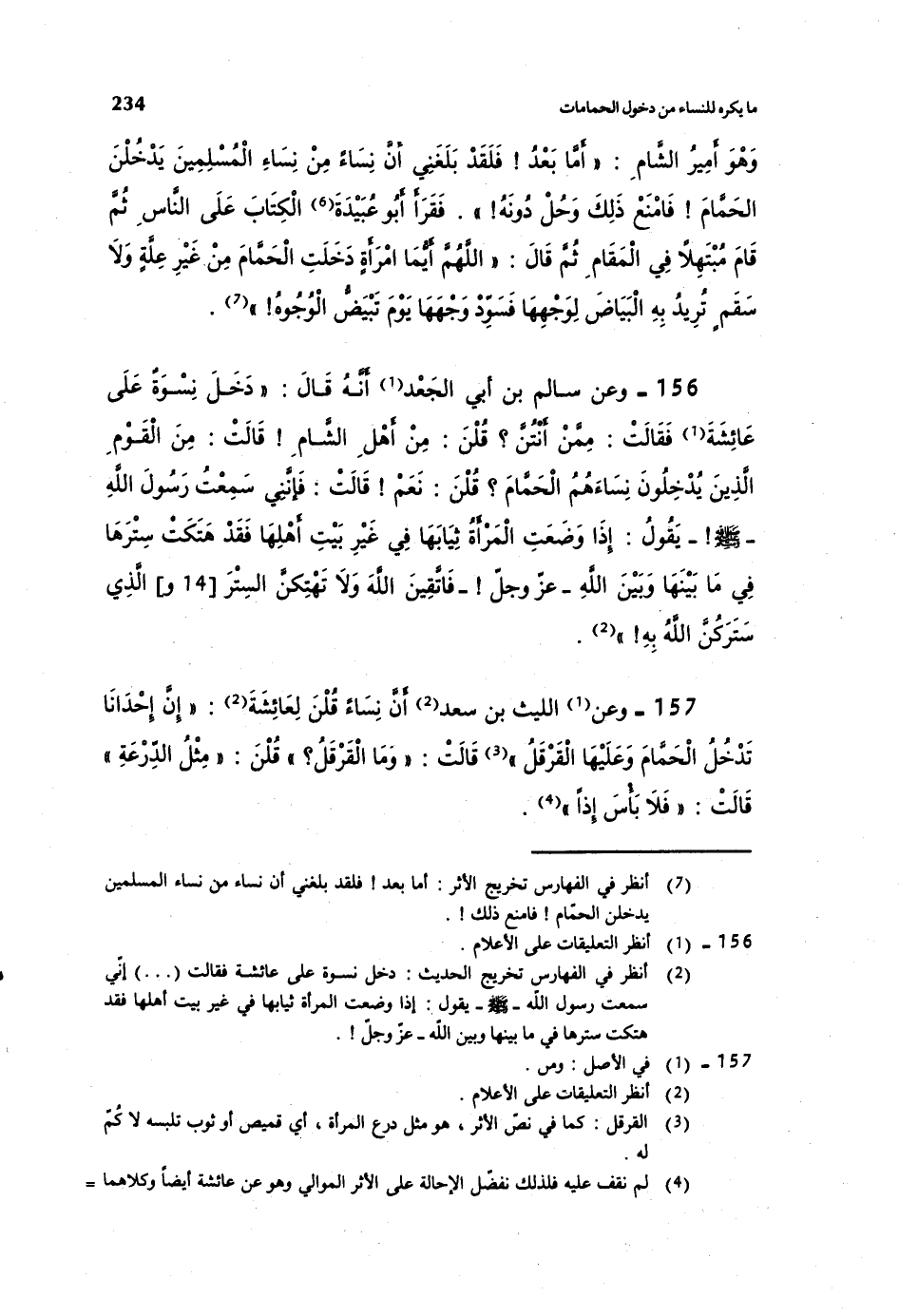 157- وعن الليث بن سعد أن نساءً قلن لعائشة: ((إن إحدانا تدخل الحمام وعليها القرقل)) قالت: ((وما القرقل؟)) قلن: ((مثل الدرعة)) قالت: ((فلا بأس إذاً)) .