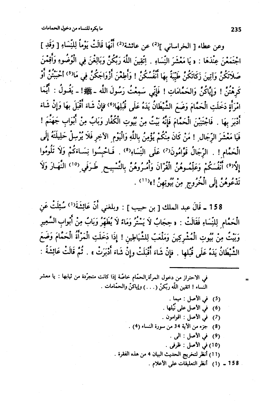 158- قال عبد الملك [بن حبيب] : وبلغني أن عائشة سئلت عن الحمام للنساء فقالت: ((حجابٌ لا يستر، وماءٌ لا يطهر، وبابٌ من أبواب السعير، وبيتٌ من بيوت المشركين، وملعبٌ للشياطين! إذا دخلت المرأة الحمام وضع الشيطان يده على قبلها. فإن شاء أقبلت وإن شاء أدبرت)) . ثم قالت عائشة: