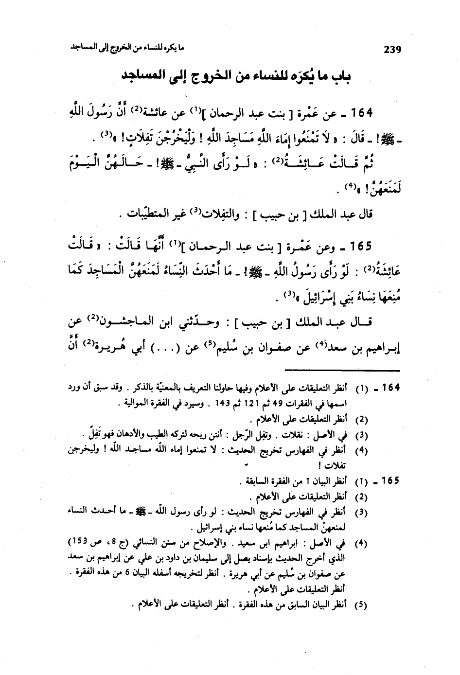 165- وعن عمرة [بنت عبد الرحمن] أنها قالت: ((قالت عائشة: لو رأى رسول الله صلى الله عليه وسلم ما أحدث النساء لمنعهن المساجد كما منعها نساء بني إسرائيل)) .