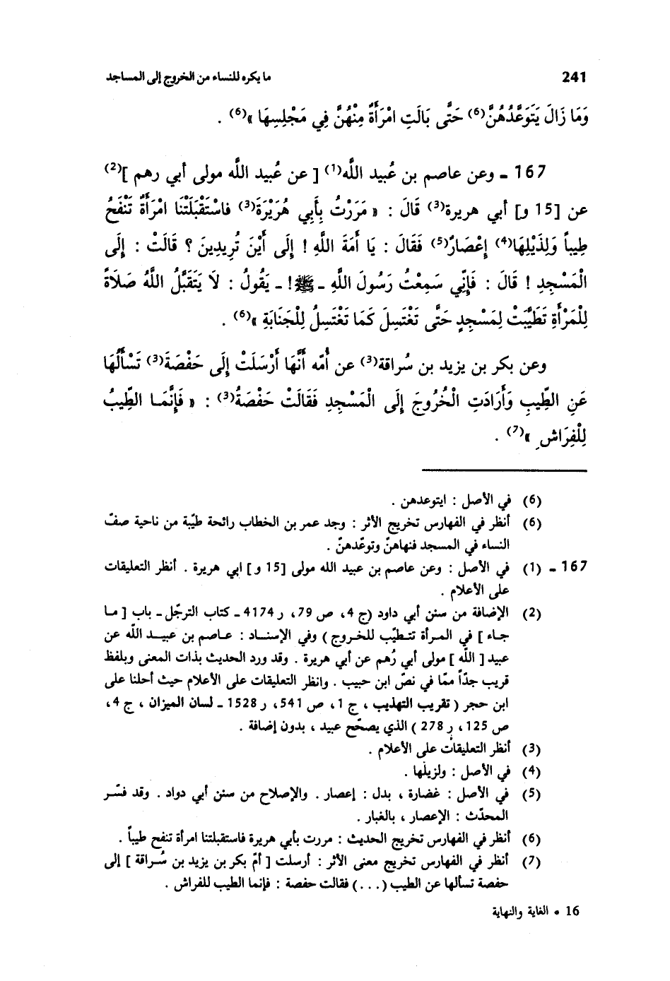 167- وعن عاصم بن عبيد الله [عن عبيد الله مولى أبي رهم] عن أبي هريرة قال: ((مررت بأبي هريرة فاستقبلتنا امرأةٌ تنفح طيباً ولذيلها إعصارٌ فقال: يا أمة الله! إلى أين تريدين؟ قالت: إلى المسجد! قال: فإني سمعت رسول الله صلى الله عليه وسلم يقول: لا يتقبل الله صلاةً للمرأة تطيبت لمسجدٍ حتى تغتسل كما تغتسل للجنابة)) .