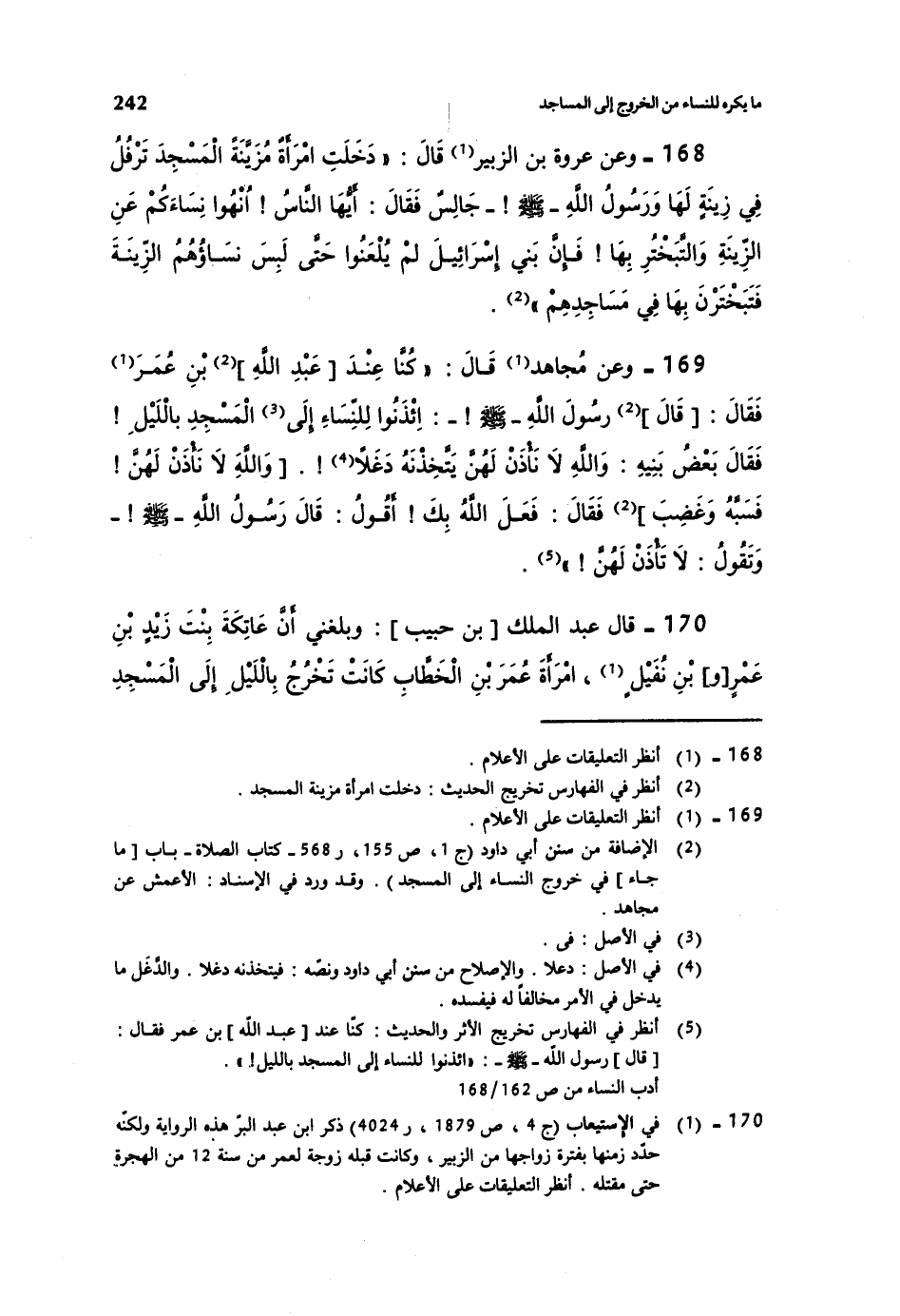170- قال عبد الملك [بن حبيب] : وبلغني أن عاتكة بنت زيد بن عمرو [بن] نفيلٍ، امرأة عمر بن الخطاب كانت تخرج بالليل إلى المسجد