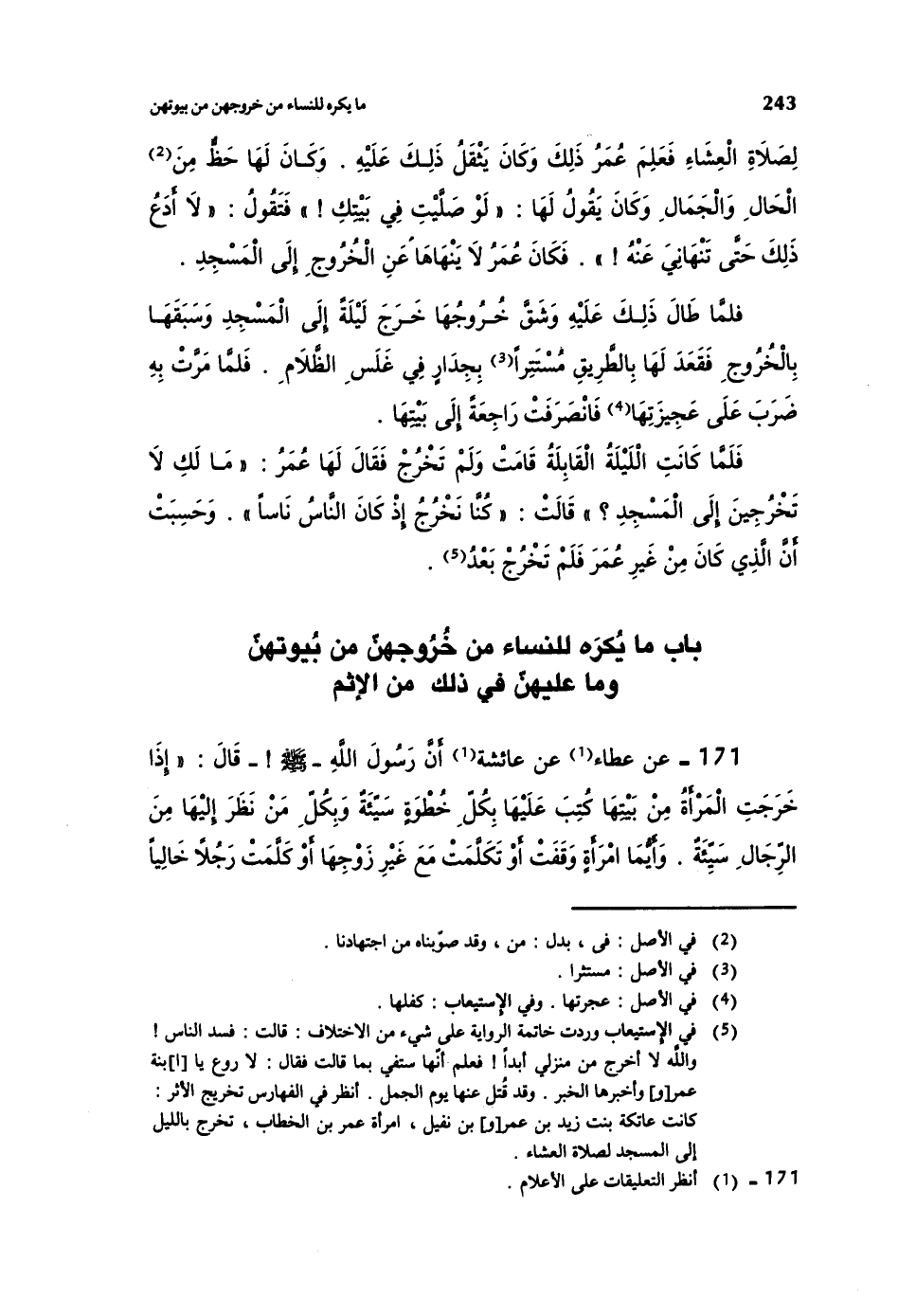 171- عن عطاء عن عائشة أن رسول الله صلى الله عليه وسلم قال: ((إذا خرجت المرأة من بيتها كتب عليها بكل خطوةٍ سيئةٌ وبكل من نظر إليها من الرجال سيئةٌ. وأيما امرأةٍ وقفت أو تكلمت مع غير زوجها أو كلمت رجلاً خالياً