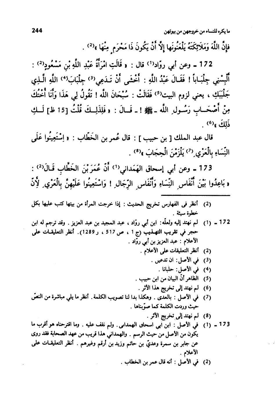 172- وعن أبي رواد قال: ((قالت امرأة عبد الله بن مسعود: ألبسني جلباباً! فقال عبد الله: أخشى أن تدعي جلباب الله الذي جلببك، يعني لزوم البيت فقالت: سبحان الله! تقول لي هذا وأنا أختك من أصحاب رسول الله صلى الله عليه وسلم قال: ((فلذلك قلت لك ذلك)) .