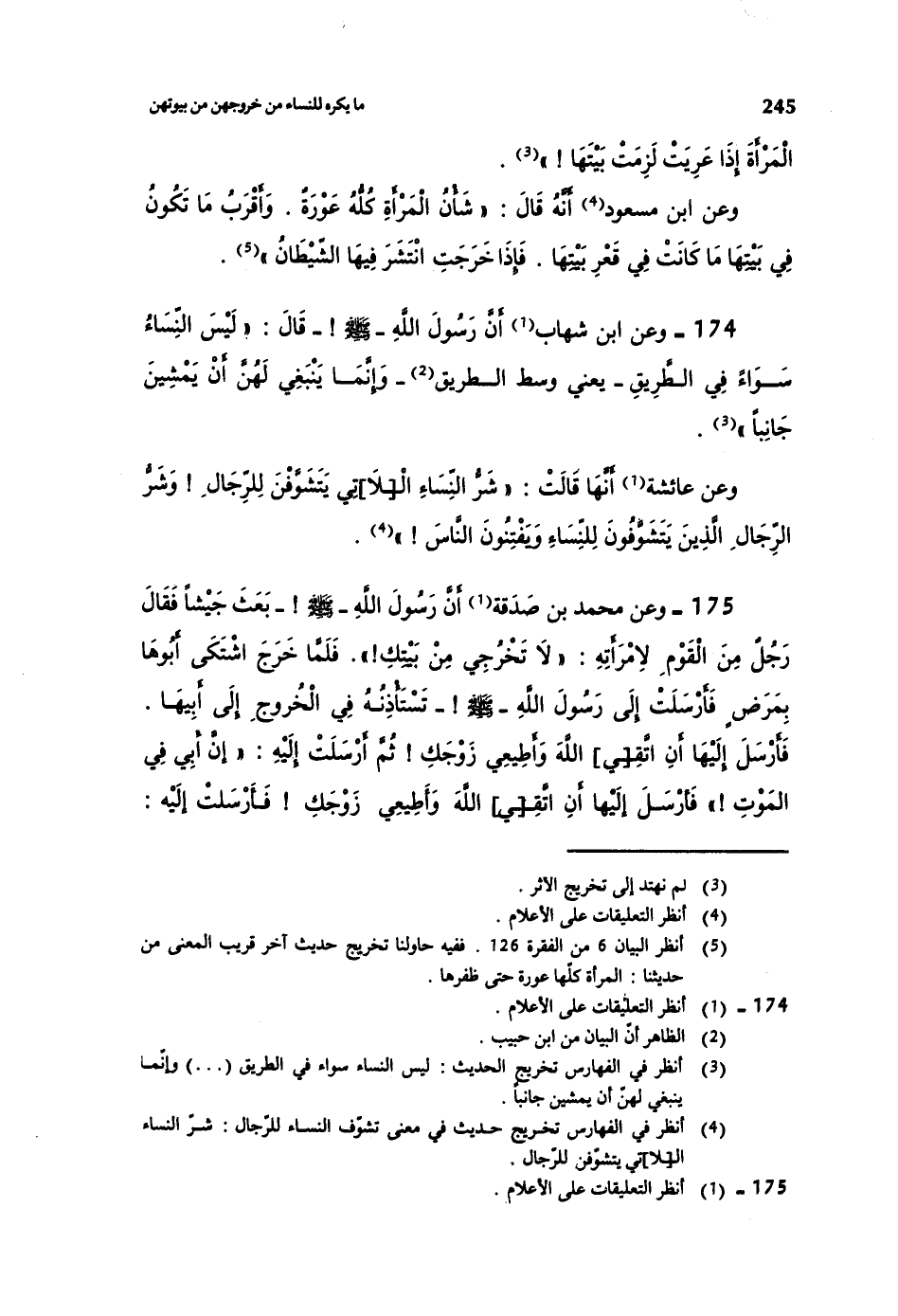 174- وعن ابن شهاب أن رسول الله صلى الله عليه وسلم قال: ((ليس النساء سواءً في الطريق -يعني وسط الطريق- وإنما ينبغي لهن أن يمشين جانباً)) .