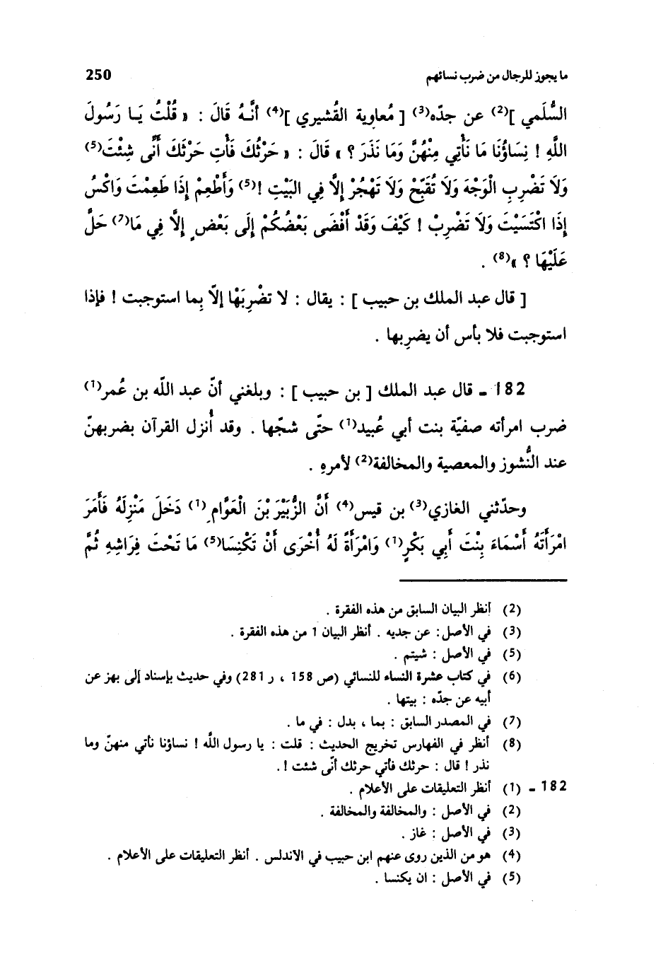 182- قال عبد الملك [بن حبيب] : وبلغني أن عبد الله بن عمر ضرب امرأته صفية بنت أبي عبيد حتى شجها. وقد أنزل القرآن بضربهن عند النشوز والمعصية والمخالفة لأمره.