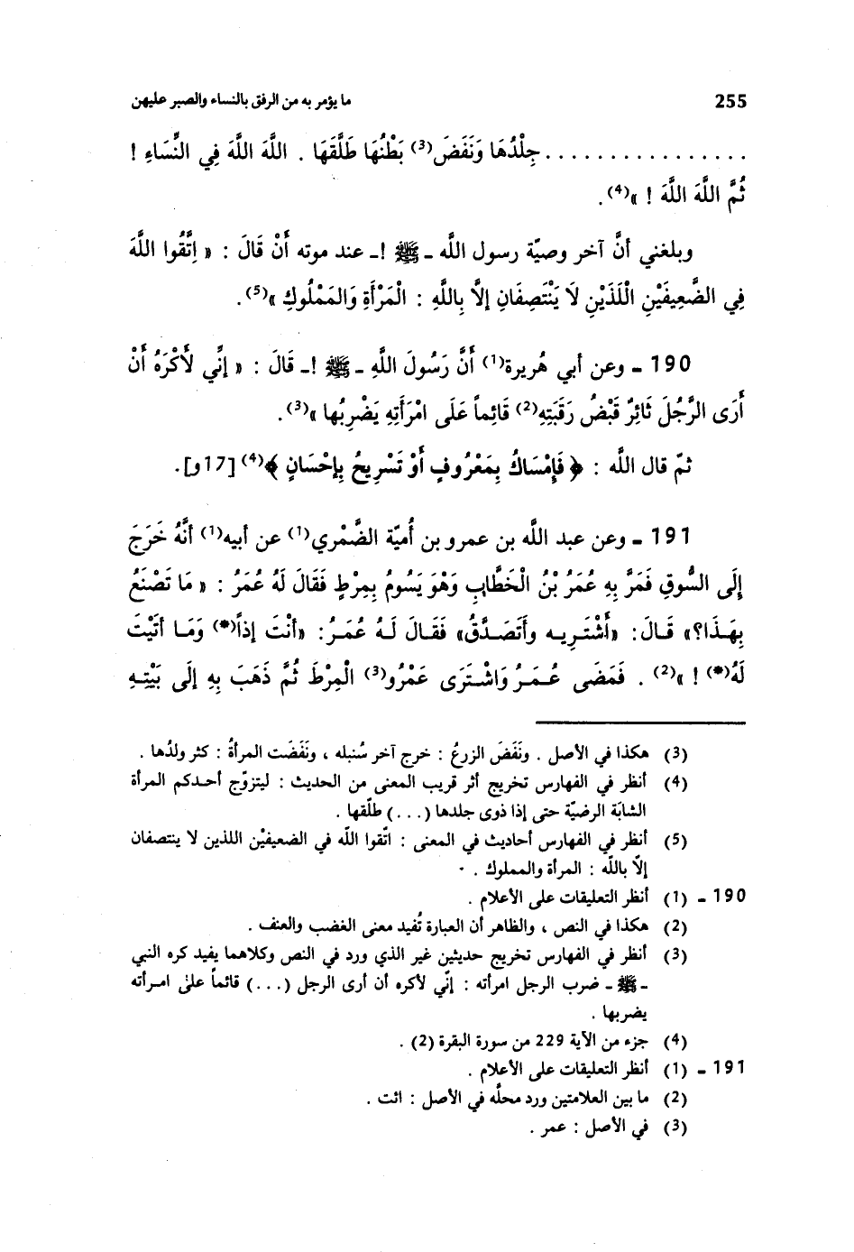 190- وعن أبي هريرة أن رسول الله صلى الله عليه وسلم قال: ((إني لأكره أن أرى الرجل ثائر قبض رقبته قائماً على امرأته يضربها)) .
