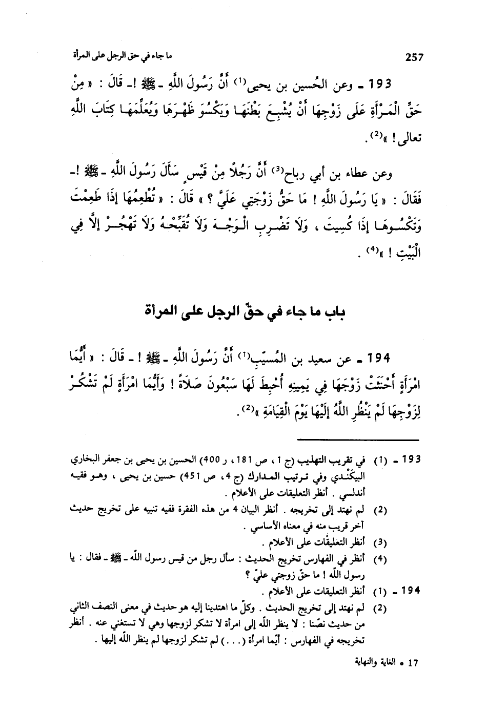 193- وعن الحسين بن يحيى أن رسول الله صلى الله عليه وسلم قال: ((من حق المرأة على زوجها أن يشبع بطنها ويكسو ظهرها ويعلمها كتاب الله تعالى!)) .