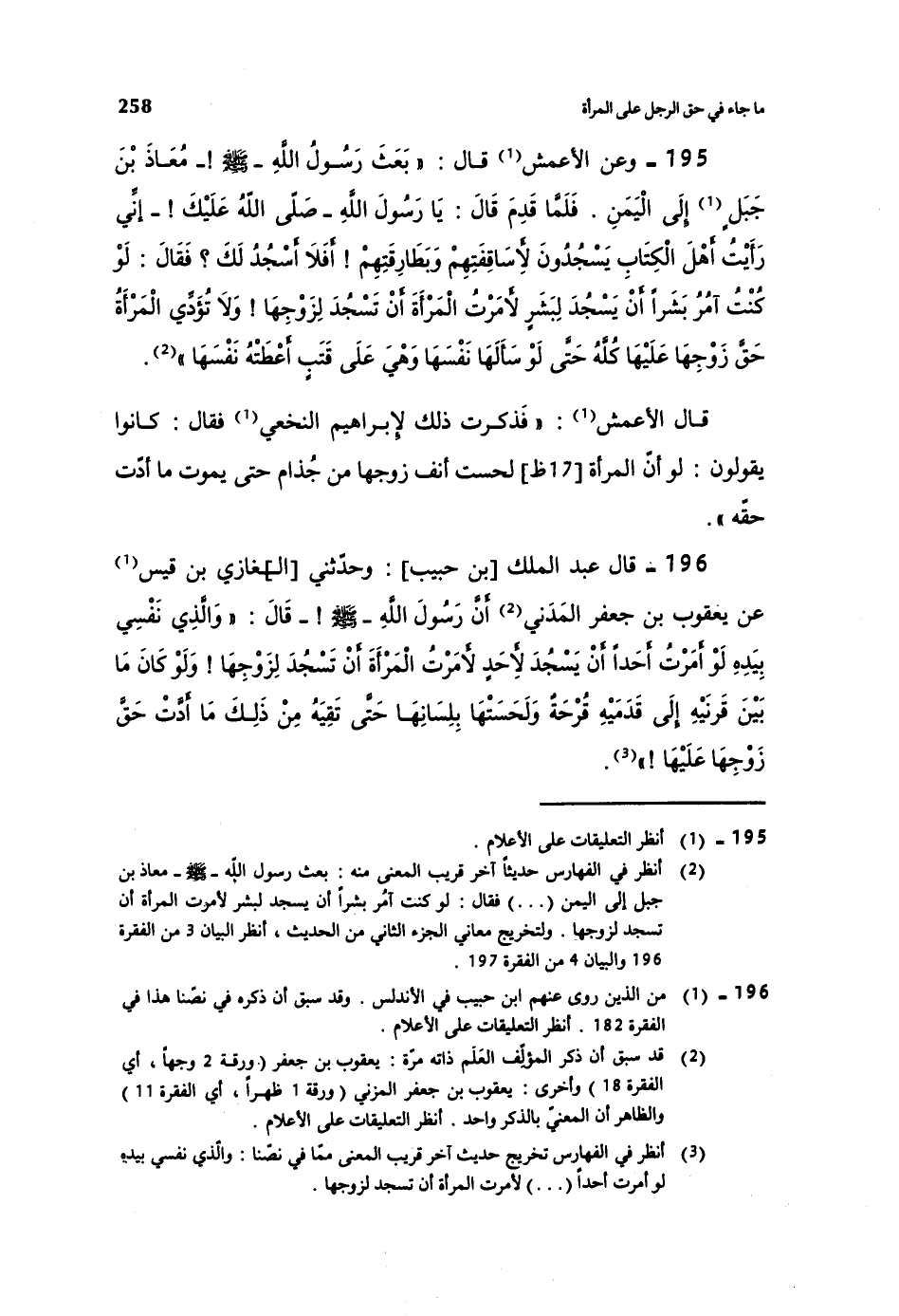 195- وعن الأعمش قال: ((بعث رسول الله صلى الله عليه وسلم معاذ بن جبلٍ إلى اليمن. فلما قدم قال: يا رسول الله -صلى الله عليك! - إني رأيت أهل الكتاب يسجدون لأساقفتهم وبطارقتهم! أفلا أسجد لك؟ فقال: لو كنت آمر بشراً أن يسجد لبشرٍ لأمرت المرأة أن تسجد لزوجها! ولا تؤدي المرأة حق زوجها عليها كله حتى لو سألها نفسها وهي على قتبٍ أعطته نفسها)) .