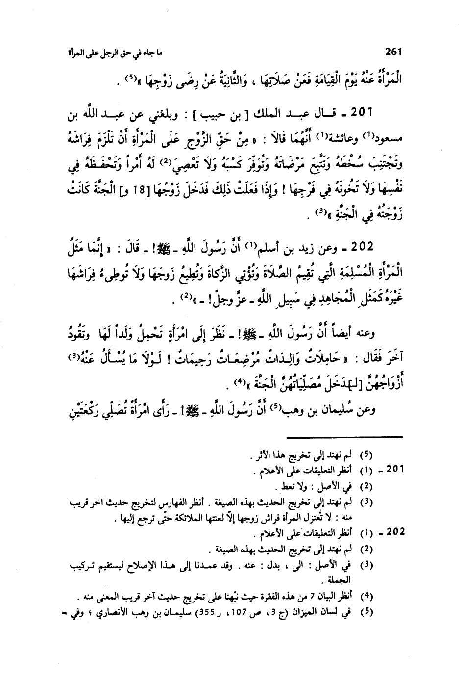 201- قال عبد الملك [بن حبيب] : وبلغني عن عبد الله بن مسعود، وعائشة أنهما قالا: ((من حق الزوج على المرأة أن تلزم فراشه، وتجتنب سخطه، وتتبع مرضاته، وتوفر كسبه، ولا تعصي له أمراً، وتحفظه في نفسها، ولا تخونه في فرجها! وإذا فعلت ذلك فدخل زوجها الجنة كانت زوجته في الجنة)) .