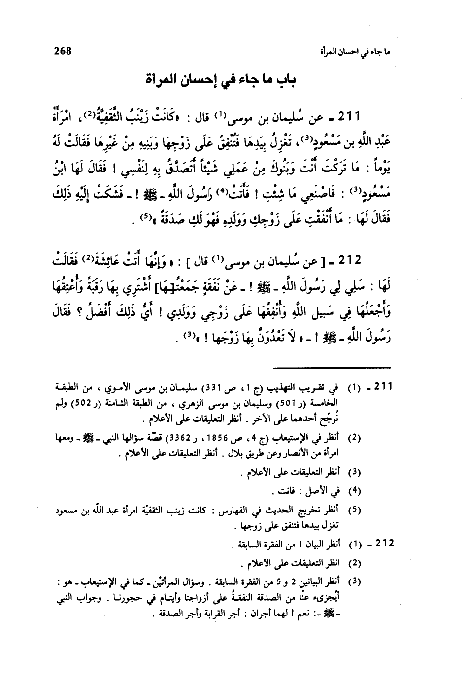 211- عن سليمان بن موسى قال: ((كانت زينب الثقفية، امرأة عبد الله بن مسعودٍ، تغزل بيدها فتنفق على زوجها وبنيه من غيرها فقالت له يوماً: ما تركت أنت وبنوك من عملي شيئاً أتصدق به لنفسي! فقال لها ابن مسعودٍ: فاصنعي ما شئت! فأتت رسول الله صلى الله عليه وسلم فشكت إليه ذلك فقال لها: ما أنفقت على زوجك وولده فهو لك صدقةٌ)) .