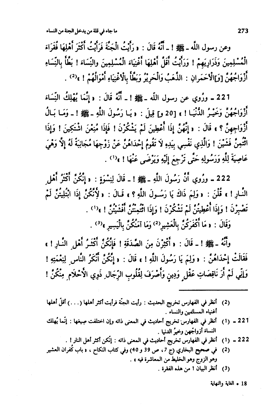 222- وروي أن رسول الله صلى الله عليه وسلم قال: لنسوةٍ: ((إنكن أكثر أهل النار! قلن: ((ولم ذاك يا رسول الله؟)) قال: ((لأنكن إذا ابتليتن لم تصبرن! وإذا أعطيتن لم تشكرن! وإذا ائتمنتن أفشيتن!)) .