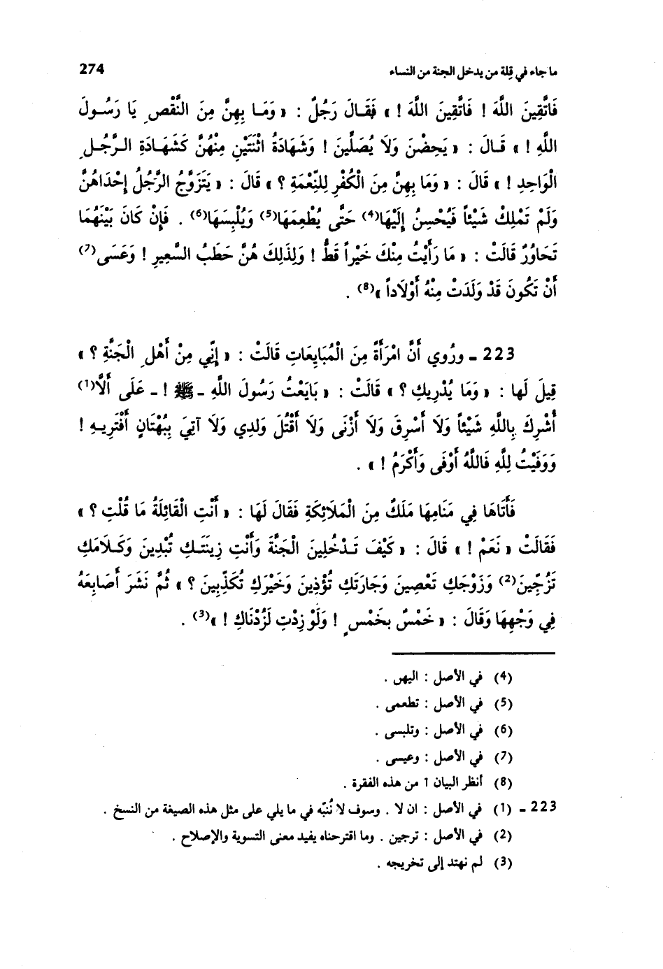 223- وروي أن امرأةً من المبايعات قالت: ((إني من أهل الجنة؟)) قيل لها: ((وما يدريك؟)) قالت: ((بايعت رسول الله صلى الله عليه وسلم على ألا أشرك بالله شيئاً ولا أسرق ولا أزني، ولا أقتل ولدي، ولا آتي بهتانٍ أفتريه! ووفيت لله فالله أوفى وأكرم!)) .