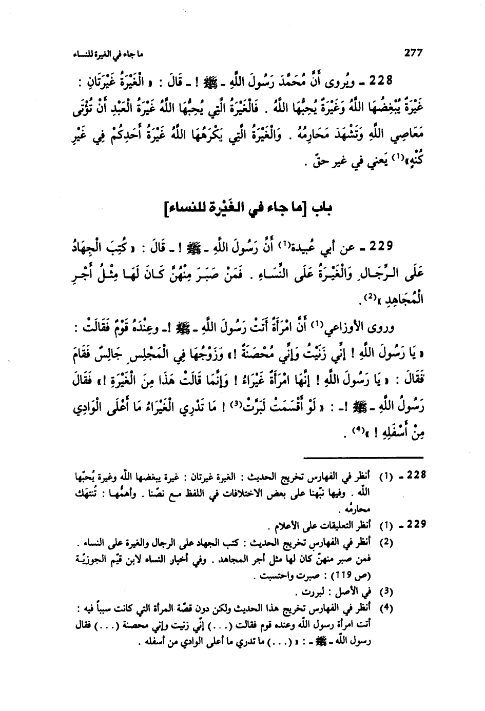 229- عن أبي عبيدة أن رسول الله صلى الله عليه وسلم قال: ((كتب الجهاد على الرجال، والغيرة على النساء. فمن صبر منهن كان لها مثل أجر المجاهد)) .