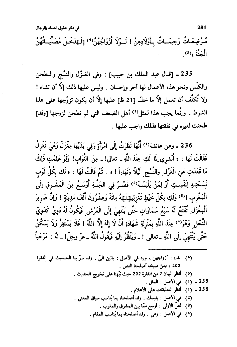 235-[قال عبد الملك بن حبيب] : وفي الغزل والنسج والطحن والكنس ونحو هذه الأعمال لها أجر وإحسان. وليس عليها ذلك إلا أن تشاء! ولا تكلف أن تعمل إلا ما خف عليها إلا أن يكون تزوجها على هذا الشرط. وإنما يجب هذا لمثل أهل الضعف التي لم تطحن لزوجها [وقد] طحنت لغيره في نفقتها فذلك واجب عليها.