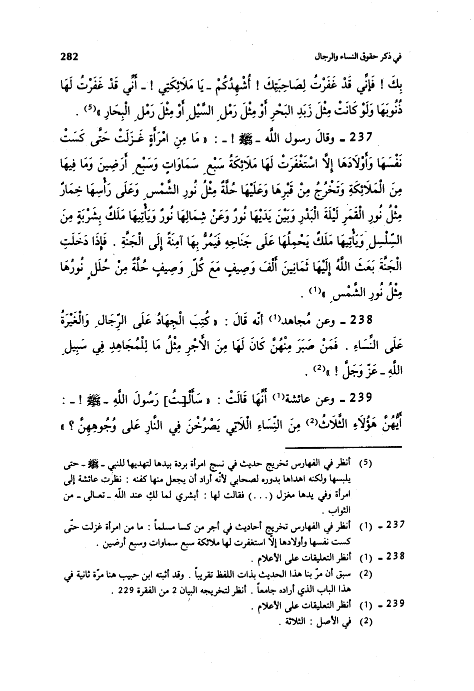 238- وعن مجاهد أنه قال: ((كتب الجهاد على الرجال، والغيرة على النساء. فمن صبر منهن كان لها من الأجر مثل ما للمجاهد في سبيل الله - عز وجل!)) .