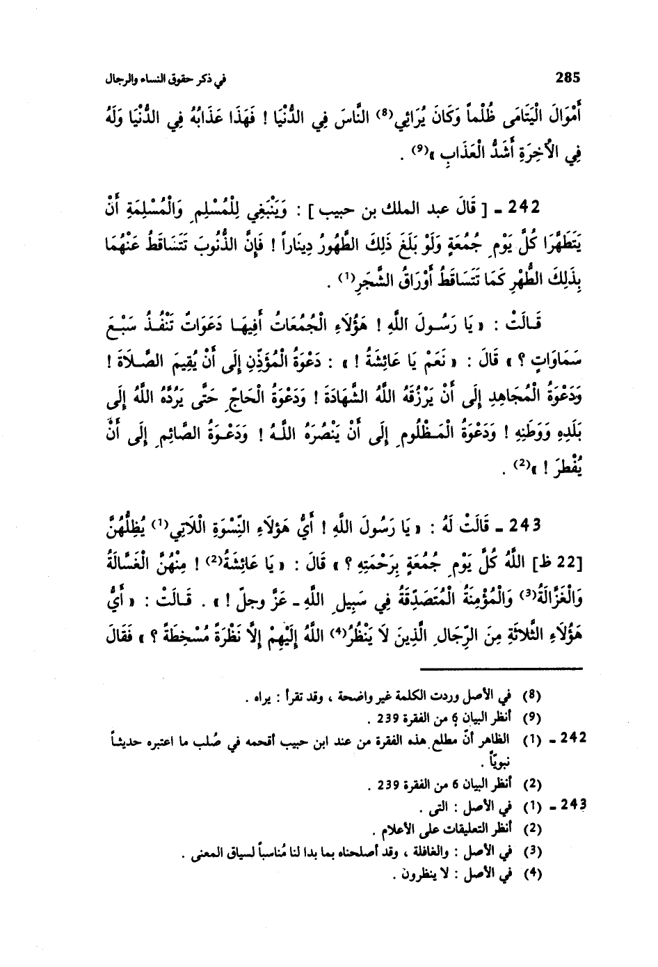 242-[قال عبد الملك بن حبيب] : وينبغي للمسلم والمسلمة أن يتطهرا كل يوم جمعةٍ ولو بلغ ذلك الطهور ديناراً! فإن الذنوب تتساقط عنهما بذلك الطهر كما تتساقط أوراق الشجر.