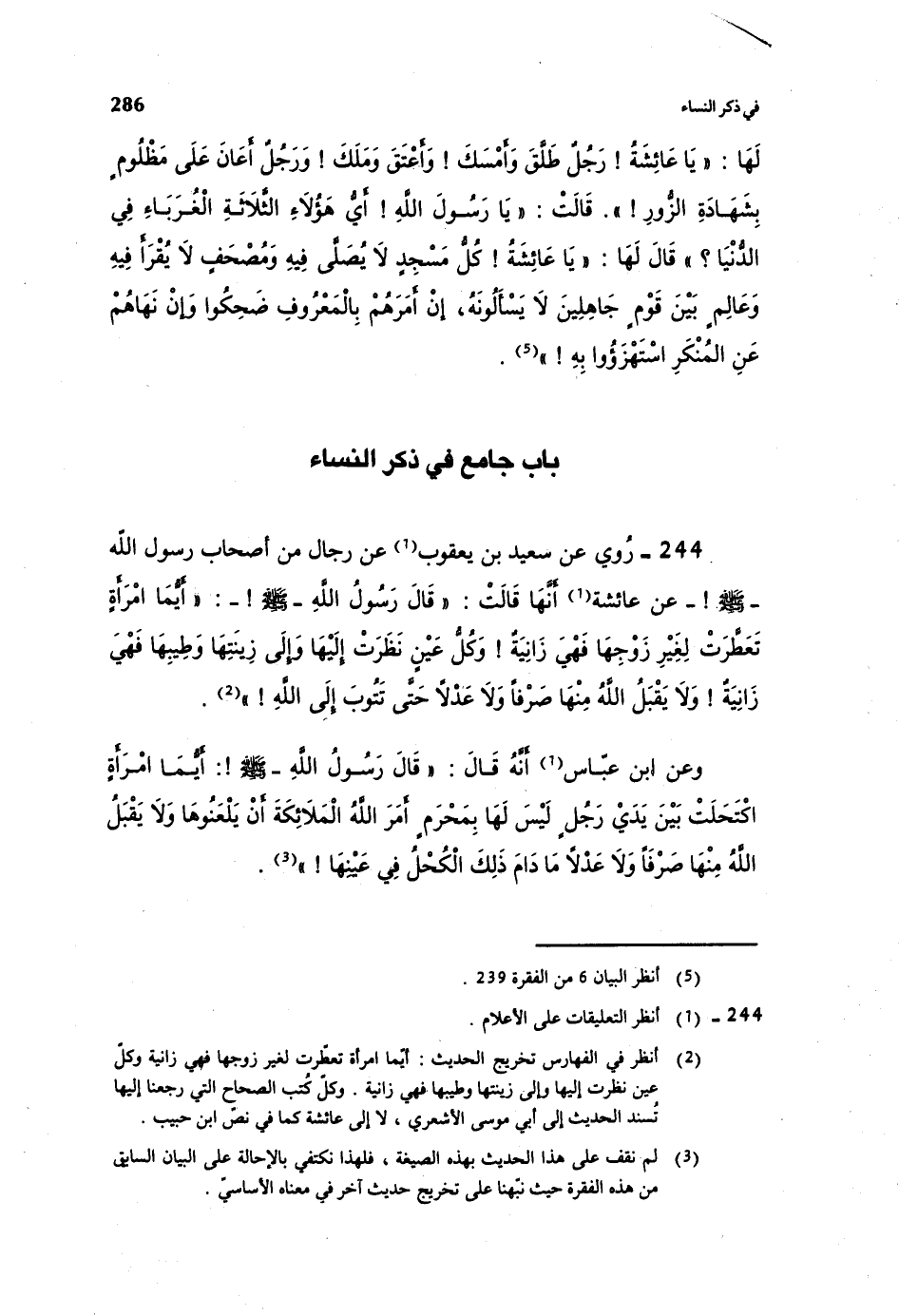 244- روي عن سعيد بن يعقوب عن رجال من أصحاب رسول الله صلى الله عليه وسلم عن عائشة أنها قالت: ((قال رسول الله صلى الله عليه وسلم: ((أيما امرأة تعطرت لغير زوجها فهي زانيةٌ! وكل عينٍ نظرت إليها وإلى زينتها وطيبها فهي زانيةٌ! ولا يقبل الله منها صرفاً ولا عدلاً حتى تتوب إلى الله!)) .