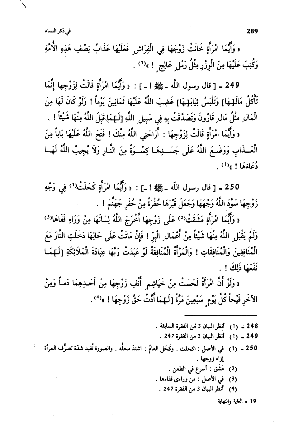 250-[قال رسول الله صلى الله عليه وسلم] : ((وأيما امرأةٍ كحلت في وجه زوجها سود الله وجهها وجعل قبرها حفرةً من حفر جهنم!)) .