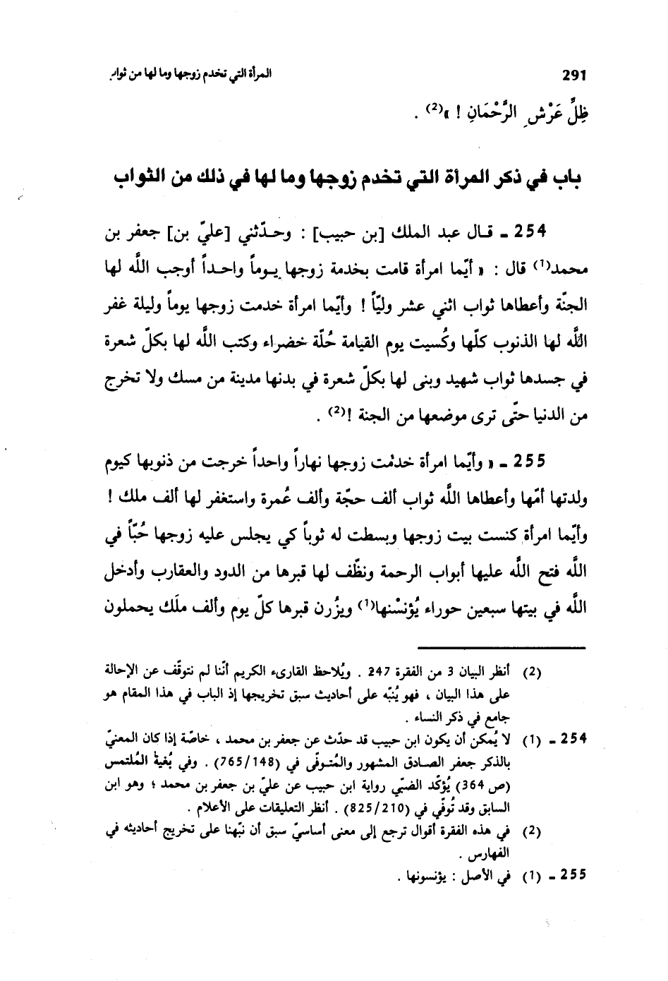 254- قال عبد الملك [بن حبيب] : وحدثني [علي بن] جعفر بن محمد قال: ((أيما امرأة قامت بخدمة زوجها يوماً واحداً أوجب الله لها الجنة، وأعطاها ثواب اثني عشر ولياً! وأيما امرأة خدمت زوجها يوماً وليلة غفر الله لها الذنوب كلها، وكسيت يوم القيامة حلة خضراء، وكتب الله لها بكل شعرة في جسدها ثواب شهيد، وبنى لها بكل شعرة في بدنها مدينة من مسك، ولا تخرج من الدنيا حتى ترى موضعها من الجنة!)) .
