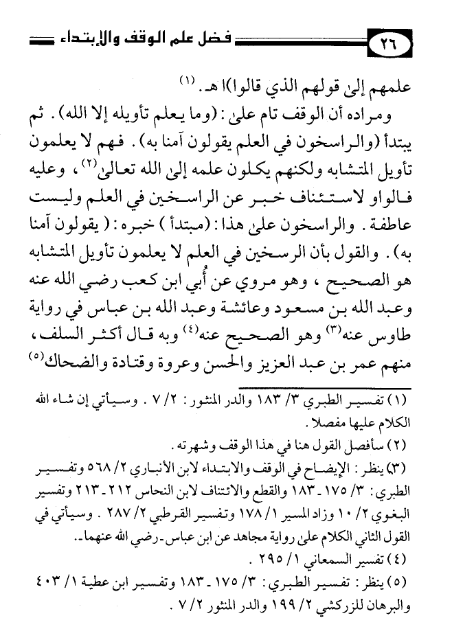 ومراده أن الوقف تام على {وَمَا يَعْلَمُ تَأْوِيلَهُ إِلَّا اللهُ} ثم يبتدأ {وَالرَّاسِخُونَ فِي الْعِلْمِ يَقُولُونَ آمَنَّا بِهِ} فهم لا يعلمون تأويل المتشابه ولكنهم يكلون علمه إلى الله تعالى (¬2)، وعليه فـ"الواو" لاستئناف خبر عن الراسخين في العلم وليست عاطفة، و (الراسخون) على هذا مبتدأ خبره (يقولون آمنا به) والقول بأن الراسخين في العلم لا يعلمون تأويل المتشابه هو الصحيح، وهو مروي عن أبي كعب رضي الله عنه وعبد الله بن مسعود وعائشة وعبد الله بن عباس في رواية طاووس عنه (¬3)، وهو الصحيح عنه (¬4)، وبه قال أكثر السلف، منهم عمر بن عبد العزيز والحسن وعروة وقتادة والضحاك (¬5).