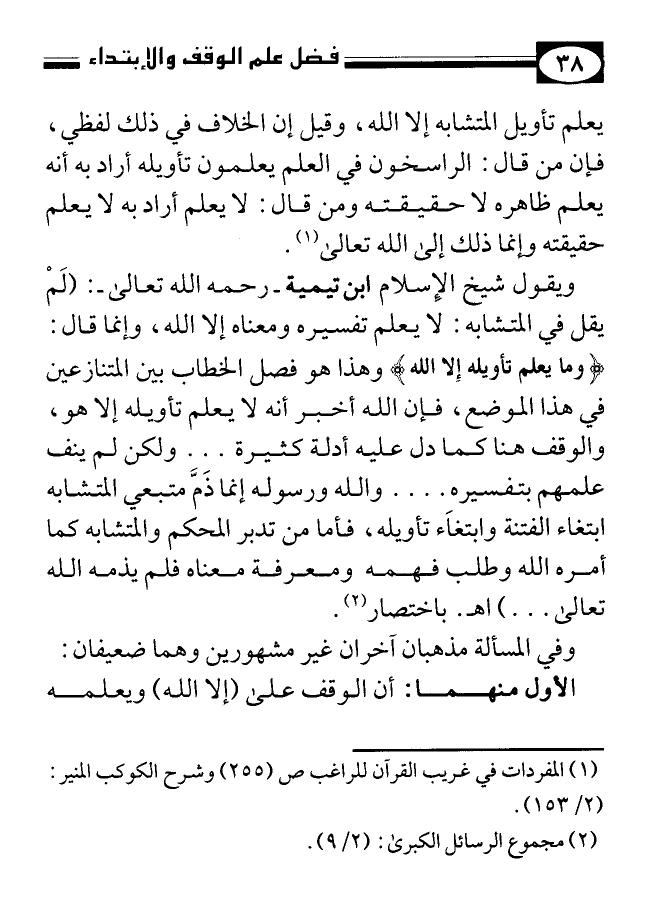 ويقول شيخ الإسلام ابن تيمية رحمه الله تعالى: (لم يقل في المتشابه: لا يعلم تفسيره ومعناه إلا الله، وإنما قال: {وَمَا يَعْلَمُ تَأْوِيلَهُ إِلَّا اللهُ} وهذا هو فصل الخطاب بين المتنازعين في هذا الموضع، فإن الله أخبر أنه لا يعلم تأويله إلا هو والوقف هنا كما دل عليه أدلة كثيرة .. ولكن لم ينفِ علمهم بتفسيره .. والله ورسوله إنما ذم متبعي المتشابه ابتغاء الفتنة وابتغاء تأويله، فأما من تدبر المحكم والمتشابه كما أمره الله وطلب فهمه ومعرفة معناه فلم يذمه الله تعالى .. ) أ. هـ باختصار (¬2).