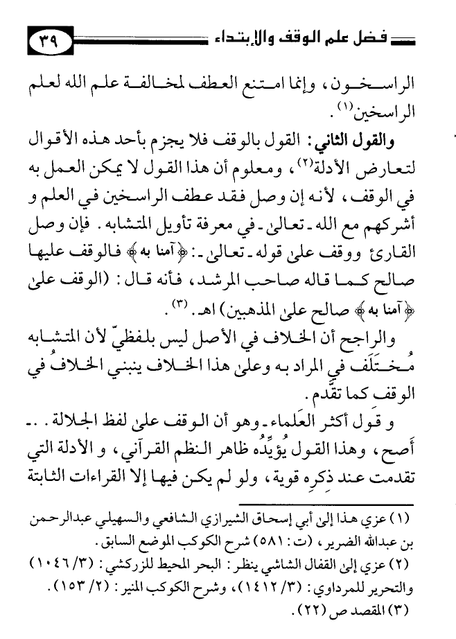 والقول الثاني: القول بالوقف فلا يجزم بأحد هذه الأقوال لتعارض الأدلة (¬2)، ومعلوم أن هذا القول لا يمكن العمل به في الوقف، لأنه إن وصل فقد عطف الراسخين في العلم، وأشركهم مع الله تعالى في معرفة تأويل المتشابه، فإن وصل القارئ ووقف على قوله تعالى: {آمَنَّا بِهِ} فالوقف عليها صالح كما قاله صاحب المرشد، فإنه قال: (الوقف على {آمَنَّا بِهِ} صالح على المذهبين).أ. هـ (¬3).