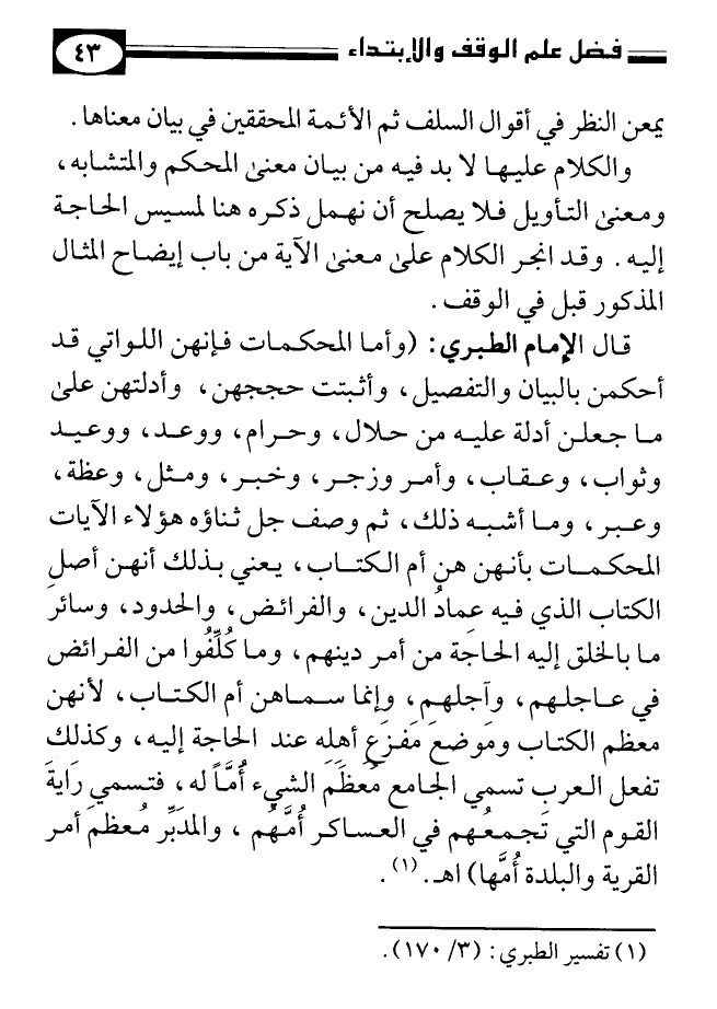 قال الإمام الطبري: (وأما المحكمات فإنهن اللواتي قد أحكمن بالبيان والتفصيل، وأثبتت حججهن، وأدلتهن على ما جعلن أدلة عليه من حلال وحرام ووعد ووعيد وثواب وعقاب وأمر وزجر وخبر ومثل وعظة وعبر وما أشبه ذلك، ثم وصف جل ثناؤه هؤلاء الآيات المحكمات بأنهن هن أم الكتاب، يعني بذلك أنهن أصل الكتاب الذي فيه عماد الدين، والفرائض، والحدود، وسائر ما بالخلق إليه الحاجة من أمر دينهم، وما كلفوا من الفرائض في عاجلهم، وآجلهم وإنما سماهن أم الكتاب، لأنهن معظم الكتاب وموضع مفزع أهله عند الحاجة إليه، وكذلك تفعل العرب تسمى الجامع معظم الشيء أمًّا له فتسمى راية القوم التي تجمعهم في العساكر أمهم، والمدبر معظم أمر القرية والبلدة أمها) أ. هـ (¬1).