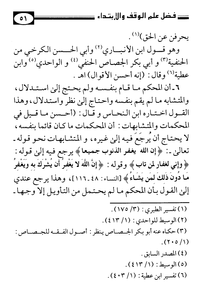 6 - إن المحكم ما قام بنفسه ولم يحتج إلى الاستدلال، والمتشابه ما لم يقم بنفسه واحتاج إلى نظر واستدلال، وهذا القول اختاره ابن النحاس وقال: (أحسن ما قيل في المحكمات والمتشابهات، أن المحكمات ما كان قائمًا بنفسه لا يحتاج أن يرجع فيه إلى غيره، والمتشابهات نحو قوله تعالى: {إِنَّ اللهَ يَغْفِرُ الذُّنُوبَ جَمِيعًا} يرجع فيه إلى قوله {وَإِنِّي لَغَفَّارٌ لِمَنْ تَابَ} وقوله: {إِنَّ اللهَ لَا يَغْفِرُ أَنْ يُشْرَكَ بِهِ وَيَغْفِرُ مَا دُونَ ذَلِكَ لِمَنْ يَشَاءُ} [النساء: 48 - 116] وهذا يرجع عندي إلى القول بأن المحكم ما لم يحتمل من التأويل إلا وجه