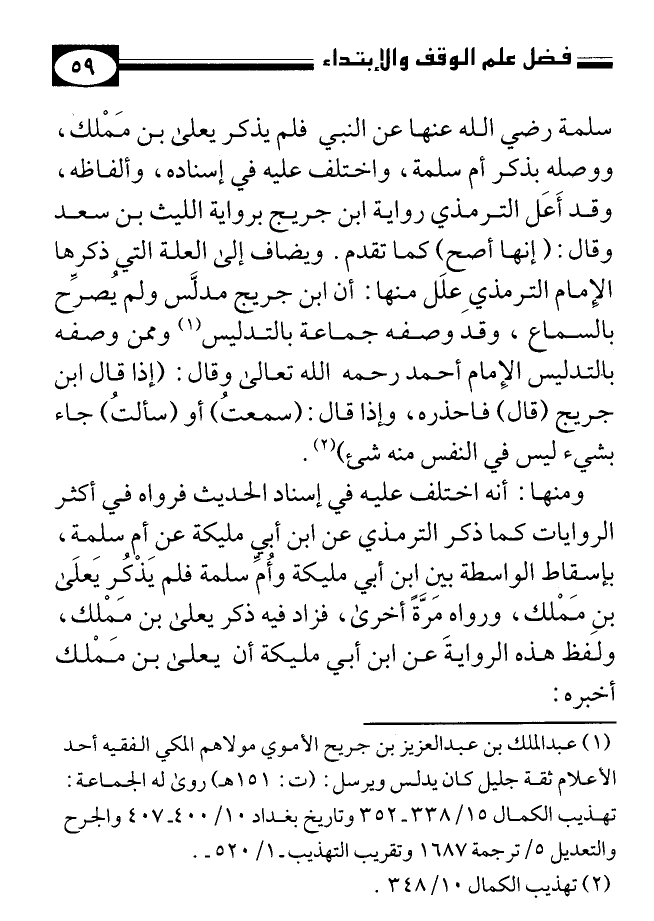 سلمة رضي الله عنها عن النبي فلم يذكر يعلى بن مملك ووصله بذكر أم سلمة، واختلف عليه في إسناده وألفاظه، وقد أعل الترمذي رواية ابن جريج برواية الليث بن سعد وقال: (إنها أصح) كما تقدم. ويضاف إلى العلة التي ذكرها الإمام الترمذي علل منها: أن ابن جريج مدلس ولم يصرح بالسماع، وقد وصفه جماعة بالتدليس (¬1)، وممن وصفه بالتدليس الإمام أحمد رحمه الله تعالى وقال: (إذا قال ابن جريج (قال) فاحذره، وإذا قال (سمعت) أو (سألت) جاء بشيء ليس في النفس منه شيء (¬2).