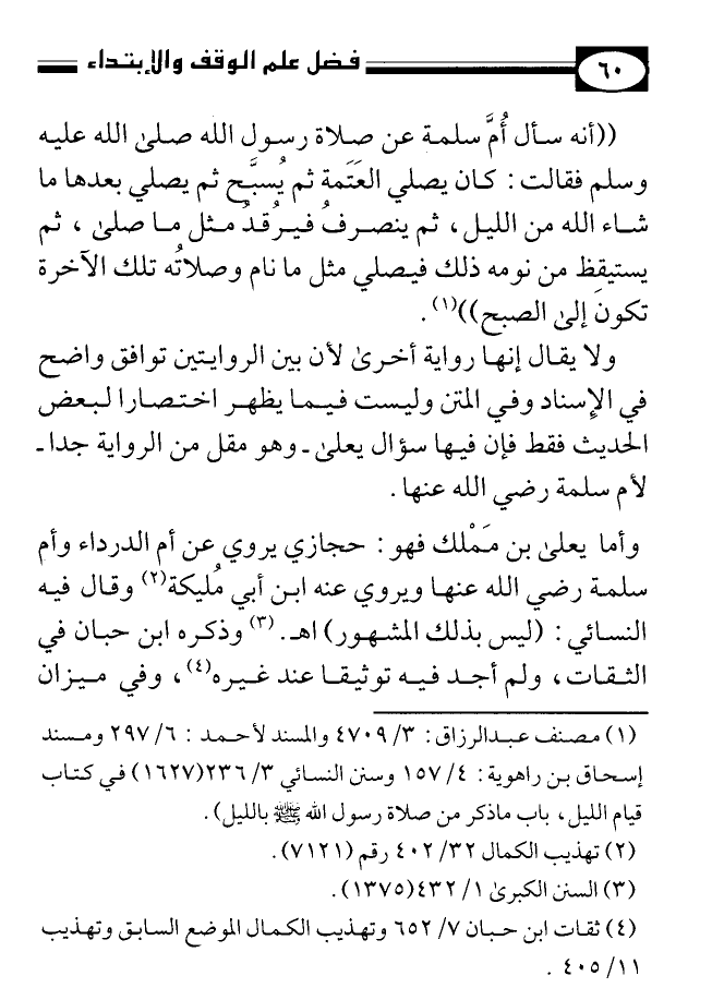 «أنه سأل أم سلمة عن صلاة رسول الله - صلى الله عليه وسلم - فقالت: كان يصلي العتمة ثم يسبح ثم يصلي بعدها ما شاء الله من الليل، ثم ينصرف فيرقد مثل ما صلى، ثم يستيقظ من نومه ذلك فيصلي مثل ما نام وصلاته تلك الآخرة تكون إلى الصبح» (¬1).
