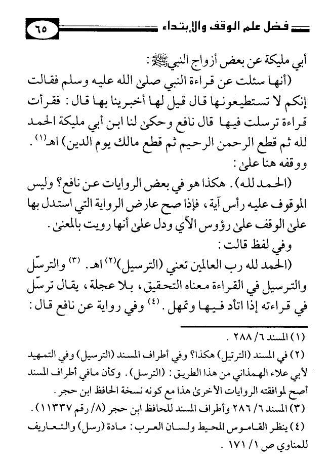 (أنها سئلت عن قراءة النبي - صلى الله عليه وسلم - فقالت إنكم لا تستطيعونها قال قيل لها أخبرينا بها قال: فقرأت قراءة ترسلت فيها قال نافع وحكى لنا ابن أبي مليكة الحمد لله ثم قطع الرحمن الرحيم ثم قطع مالك يوم الدين) أ. هـ (¬1).