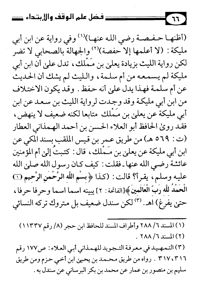 (أظنها حفصة رضي الله عنها) (¬1) وفي رواية عن ابن أبي مليكة: (لا أعلمها إلا حفصة) (¬2) والجهالة بالصحابي لا تضر لكن رواية الليث بزيادة يعلى بن مملك، تدل على أن ابن أبي مليكة لم يسمعه من أم سلمة، والليث لم يشك أن الحديث عن أم سلمة فهذا يدل على أنه حفظ. وقد يكون الاختلاف من ابن أبي مليكة وقد وجدت لرواية الليث بن سعد عن ابن أبي مليكة عن يعلى بن مملك متابعًا لكنه ضعيف لا ينهض، فقد روى الحافظ أبو العلاء الحسن بن أحمد المهمذاني العطار (ت: 569هـ) من طريق عمر بن قيس الملقب بسند المكي عن ابن أبي مليكة عن يعلى بن مملك، قال: كتبت إلى أم المؤمنين عائشة رضي الله عنها، فقلت: كيف كان رسول الله - صلى الله عليه وسلم - يقرأ؟ قال: (كذا {بِسْمِ اللهِ الرَّحْمَنِ الرَّحِيمِ * الْحَمْدُ لِلهِ رَبِّ الْعَالَمِينَ} [الفاتحة: 2] يبينه اسمًا اسمًا وحرفًا حرفًا، حتى يفرغ).أ. هـ (¬3).