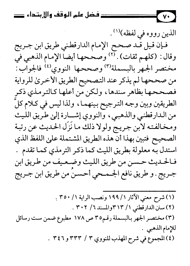 فإن قيل قد صحح الإمام الدارقطني طريق ابن جريج وقال: (كلهم ثقات (¬2) وصححها أيضًا الإمام الذهبي في مختصر الجهر بالبسملة (¬3)، وصححها النووي (¬4)، فالجواب: من صححها لم يذكر عند التصحيح الطريق الأخرى للرواية فصححها بظاهر سندها، ولكن من أعلها كالترمذي ذكر الطريقين وبين وجه الترجيح بينهما، ولذا ليس في كلام كل من الدارقطني والذهبي، والنووي إشارة إلى طريق الليث ومخالفته لابن جريج ولولا ذلك ما نزل الحديث عن رتبة الصحيح فتبين بهذا أن هذه الطريق المشتملة على اللفظ الذي استدل به معلولة بطريق الليث كما ذكر الترمذي كما تقدم. فالحديث حسن من طريق الليث وضعيف من طريق ابن جريج، وطريق نافع الجمحي أحسن من طريق ابن جريج