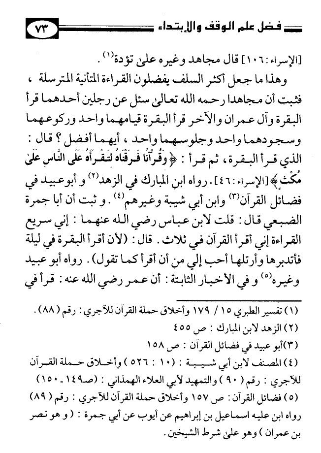 وهذا ما جعل أكثر السلف يفضلون القراءة المتأنية المترسلة، فثبتت أن مجاهدًا رحمه الله تعالى سئل عن رجلين أحدهما قرأ البقرة وآل عمران والآخر قرأ البقرة قيامهما واحد وركوعهما وسجودهما واحد وجلوسهما واحد، أيهما أفضل؟ قال: الذي قرأ البقرة ثم قرأ: {وَقُرْآنًا فَرَقْنَاهُ لِتَقْرَأَهُ عَلَى النَّاسِ عَلَى مُكْثٍ} [الإسراء: 46] رواه ابن المبارك في الزهد (¬2) وأبو عبيد في فضائل القرآن (¬3) وابن أبي شيبة وغيرهم (¬4)، وثبت أن أبا جمرة الضبعي قال: قلت لابن عباس رضي الله عنهما: إني سريع القراءة إني أقرأ القرآن في ثلاث، قال: (لأن أقرأ البقرة في ليلة فأتدبرها وأرتلها أحب إليَّ من أن أقرأ كما تقول) رواه أبو عبيد وغيره (¬5)، وفي الأخبار الثابتة: أن عمر رضي الله عنه: قرأ في