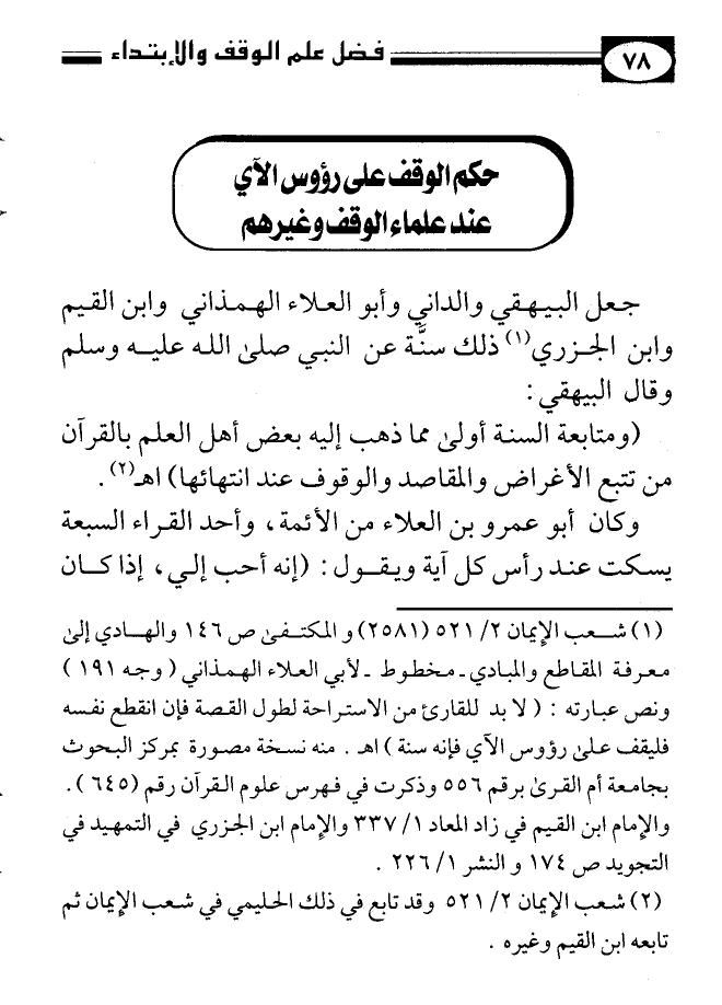 (¬1) شعب الإيمان (2/ 521) (2581) والمكتفى ص (146) والهادي إلى معرفة المقاطع والمبادي - مخطوط - لأبي العلاء الهمذاني (وجه 191) ونص عبارته: (لا بد للقارئ من الاستراحة لطول القصة فإن انقطع نفسه فليقف على رؤوس الآي فإنه سُنة) أ. هـ منه نسخة مصورة بمركز البحوث بجامعة أم القرى برقم (556) وذكرت في فهرس علوم القرآن رقم (645) والإمام ابن القيم في زاد المعاد (1/ 337) والإمام ابن الجزري في التمهيد في التجويد ص (174) والنشر (1/ 226).