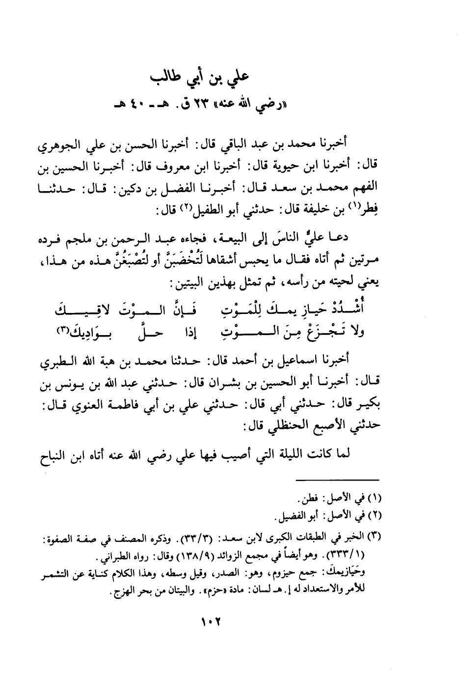 دَعَا عَلِيٌّ النَّاسَ إِلَى الْبيعَة فَجَاءَهُ عبد الرحمن بْنُ مُلْجِمٍ فَرَدَّهُ مَرَّتَيْنِ ثُمَّ أَتَاهُ فَقَالَ مَا يَحْبِسُ أَشْقَاهَا لَتُخْضَبَنَّ أَوْ لَتُصْبَغَنَّ هَذِهِ مِنْ هَذَا يَعْنِي لِحْيَتَهُ مُنْ رَأْسِهِ ثُمَّ تَمَثَّلَ بِهَذَيْنِ الْبَيْتَيْنِ ... اشْدُدْ حَيَازِيمَكَ لِلْمَوْتِ ... فَإنَّ الْمَوْتَ لاقِيكَ