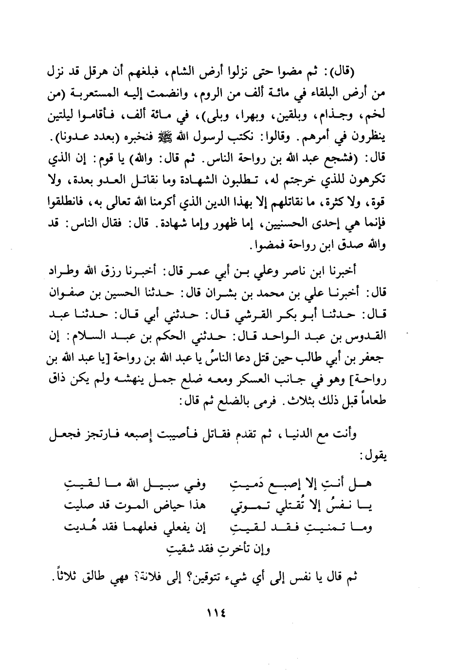 قَالَ ثُمَّ مَضُوا حَتَّى نَزَلُوا أَرْضَ الشَّامِ فَبَلَغَهُمْ أَنَّ هِرَقْلَ قد نزل من أَرض البلقاء فِي مِائَةِ أَلْفٍ مِنَ الرُّومِ وَانْضَمَّتْ إِلَيْهِ الْمُسْتَعْرَبَةُ مِنْ لَخْمٍ وَجُذَامٍ وَبَلْقَيْنٍ وَبَهْرًا وَبِلًى فِي مِائَةِ أَلْفٍ فَأَقَامُوا لَيْلَتَيْنِ يَنْظُرُونَ فِي أَمْرِهِمْ وَقَالُوا نَكْتُبُ لِرَسُولِ اللَّهِ صَلَّى اللَّهُ عَلَيْهِ وَسَلَّمَ فَنُخْبِرَهُ بِعَدَدِ عَدُوِّنَا قَالَ فَشَجَّعَ عبد الله بْنُ رَوَاحَةَ النَّاسَ ثُمَّ قَالَ وَاللَّهِ يَا قَوْمِ إِنَّ الَّذِي تَكْرَهُونَ لَلَّذِي خَرَجْتُمْ لَهُ تَطْلُبُونَ الشَّهَادَةَ وَمَا نُقَاتِلُ الْعَدُوَّ بِعِدَّةٍ وَلا قُوَّةٍ وَلا كَثْرَةٍ مَا نُقَاتِلُهُمْ إِلا بِهَذَا الدِّينِ الَّذِي أَكْرَمَنَا اللَّهُ تَعَالَى بِهِ فَانْطَلِقُوا فَإِنَّمَا هِيَ إِحْدَى الْحُسْنَيَيْنِ إِمَّا ظُهُورٌ وَإِمَّا شَهَادَةٌ قَالَ فَقَالَ النَّاسُ قَدْ وَاللَّهِ صَدَقَ ابْنُ رَوَاحَةَ فَمَضُوا