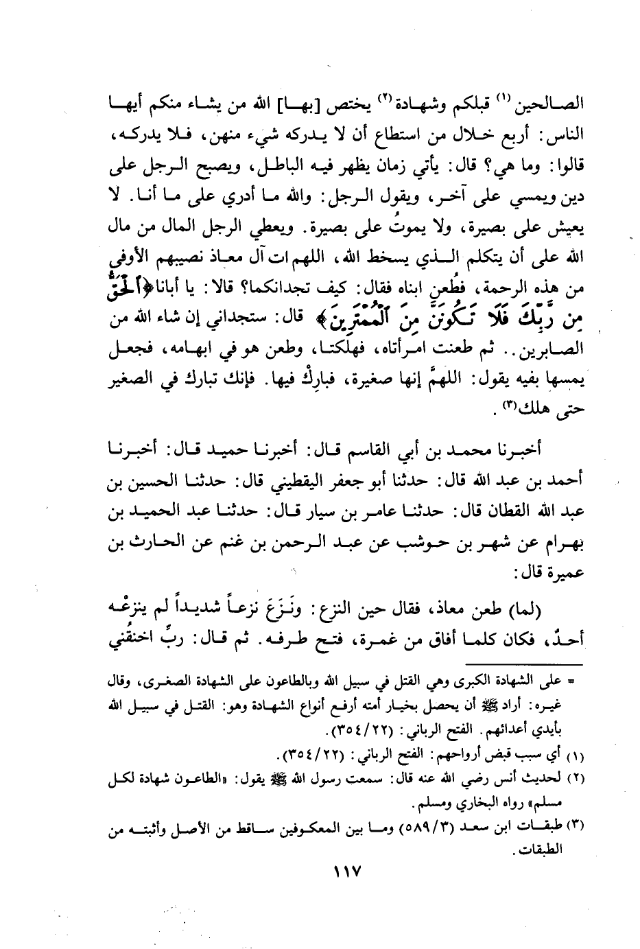 الصَّالِحِينَ قَبْلَكُمْ وَشَهَادَةٌ يَخْتَصُّ بِهَا اللَّهُ مَنْ يَشَاءُ مِنْكُمْ أَيُّهَا النَّاسُ أَرْبَعُ خِلالٍ مَنِ اسْتَطَاعَ أَنْ لَا يُدْرِكَهُ شَيْءٌ مِنْهُنَّ فَلا يُدْرِكَهُ قَالُوا وَمَا هِيَ قَالَ يَأْتِي زَمَانٌ يَظْهَرُ فِيهِ الْبَاطِلُ وَيُصْبِحُ الرَّجُلُ عَلَى دِينٍ وَيُمْسِي عَلَى آخَرٍ وَيَقُولُ الرَّجُلُ وَاللَّهِ مَا أَدْرِي عَلَى مَا أَنَا لَا يَعِيشُ عَلَى بَصِيرَةٍ وَلا يَمُوتُ عَلَى بَصِيرَةٍ وَيُعْطِي الرَّجُلُ الْمَالَ مِنْ مَالِ اللَّهِ عَلَى أَنْ يَتَكَلَّمَ الَّذِي يُسْخِطُ اللَّهَ اللَّهُمَّ آتِ آلَ مُعَاذٍ نَصِيبَهُمُ الأَوْفَى مِنْ هَذِهِ الرَّحْمَةِ فَطُعِنَ ابْنَاهُ فَقَالَ كَيْفَ تَجِدَانَكُمَا قَالا يَا أَبَانَا {الْحَقُّ مِنْ رَبِّكَ فَلا تَكُونَنَّ مِنَ الْمُمْتَرِينَ} قَالَ سَتَجِدَانِي إِنْ شَاءَ اللَّهُ مِنَ الصَّابِرِينَ ثُمَّ طُعِنَتِ امْرَأَتَاهُ فَهَلَكَتَا وَطُعِنَ هُوَ فِي إِبْهَامِهِ فَجَعَلَ يَمَسَّهَا بِفِيهِ يَقُولُ اللَّهُمَّ إِنَّهَا صَغِيرَةٌ فَبَارِكْ فِيهَا فَإِنَّكَ تُبَارِكُ فِي الصَّغِيرِ حَتَّى هَلَكَ