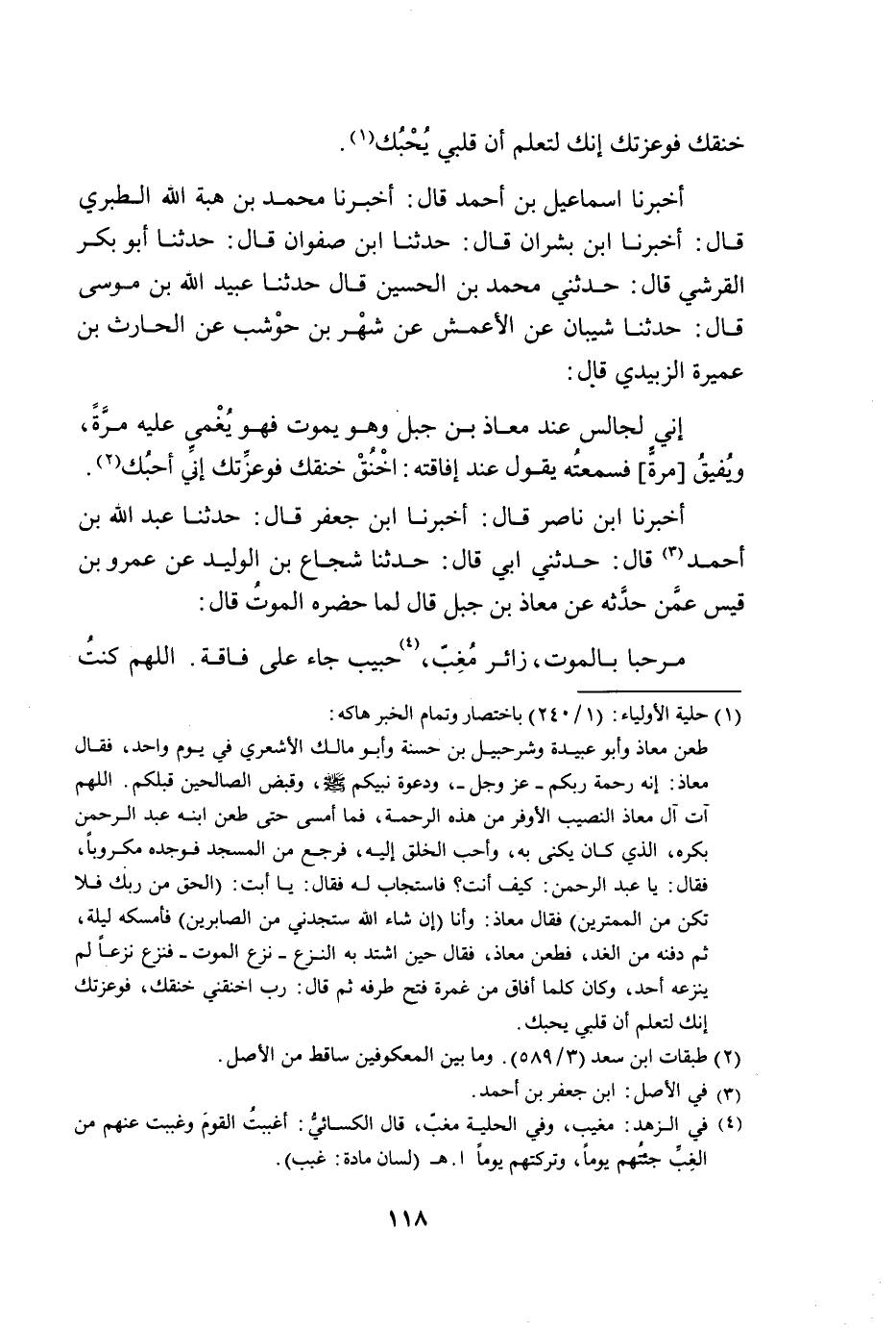 إِنِّي لَجَالِسٌ عِنْدَ مُعَاذِ بْنِ جَبَلٍ وَهُوَ يَمُوتُ فَهُوَ يُغْمَى عَلَيْهِ مَرَّةً وَيَفِيقُ مَرَّةً فَسَمِعْتُهُ يَقُولُ عِنْدَ إِفَاقَتِهِ اخْنُقْ خَنْقَكَ فَوَعِزَّتِكَ إِنَِّي أُحِبُّكَ