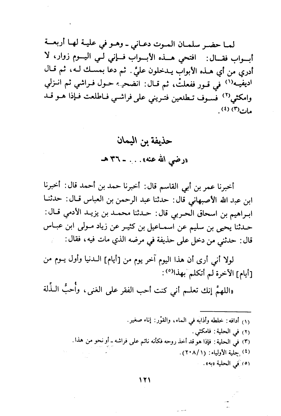 أَخْبَرَنَا عُمَرُ بْنُ أَبِي الْقَاسِمِ قَالَ أَخْبَرَنَا حَمَدُ بْنُ أَحْمَدَ قَالَ أَخْبَرَنَا ابْنُ عبد الله الْأَصْبَهَانِيّ قَالَ حَدثنَا عبد الرحمن بْنُ الْعَبَّاسِ قَالَ حَدَّثَنَا إِبْرَاهِيمُ بْنُ إِسْحَاقَ الْحَرْبِيُّ قَالَ حَدَّثَنَا مُحَمَّدُ بْنُ يَزِيدَ الآدَمِيُّ قَالَ حَدَّثَنَا يَحْيَى بْنُ سُلَيْمٍ عَنْ إِسْمَاعِيلَ بْنِ كَثِيرٍ عَنْ زِيَادٍ مَوْلَى ابْنِ عَبَّاسٍ قَالَ حَدَّثَنِي مَنْ دَخَلَ عَلَى حُذَيْفَةَ فِي مَرَضِهِ الَّذِي مَاتَ فِيهِ فَقَالَ