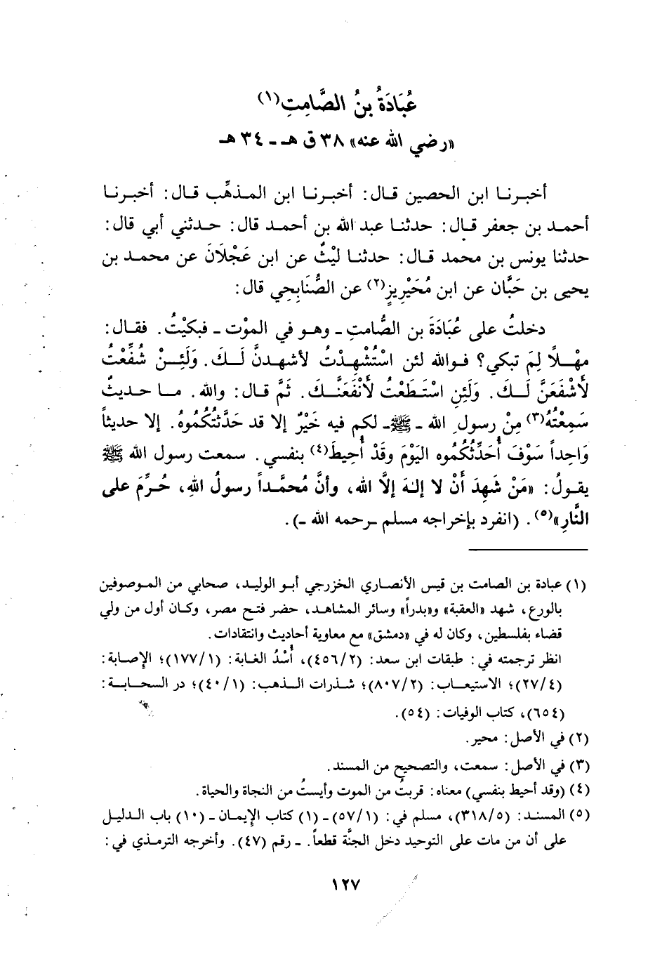 دَخَلْتُ عَلَى عُبَادَةَ بْنِ الصَّامِتِ وَهُوَ فِي الْمَوْتِ فَبَكَيْتُ فَقَالَ مَهْلا لِمَ تَبْكِي فَوَاللَّهِ لَئِنِ اسْتُشْهِدْتُ لأَشْهَدَنَّ لَكَ وَلَئِنْ شُفِّعْتُ لأَشْفَعَنَّ لَكَ وَلَئِنِ اسْتَطَعْتُ لأنْفَعَنَّكَ ثُمَّ قَالَ وَاللَّهِ مَا حَدِيثٌ سَمِعْتُهُ مِنْ رَسُولَ اللَّهِ صَلَّى اللَّهُ عَلَيْهِ وَسَلَّمَ لَكُمْ فِيهِ خَيْرٌ إِلا قَدْ حَدَّثْتُكُمُوهُ إِلا حَدِيثًا وَاحِدًا سَوْفَ أُحَدِّثُكُمُوهُ الْيَوْمَ وَقَدْ أُحِيطَ بِنَفْسِي سَمِعْتُ رَسُولَ اللَّهِ صَلَّى اللَّهُ عَلَيْهِ وَسَلَّمَ يَقُولُ مَنْ شَهِدَ أَنْ لَا إِلَهَ إِلا اللَّهُ وَأَنَّ مُحَمَّدًا رَسُولُ اللَّهِ حُرِّمَ عَلَى النَّارِ انْفَرَدَ بِإِخْرَاجِهِ مُسْلِمٌ رَحِمَهُ اللَّهُ