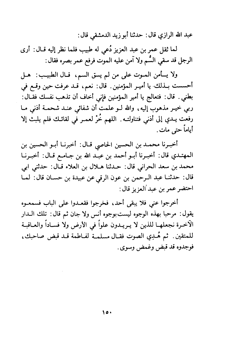 لَمَّا ثَقُلَ عُمَرُ بن عبد العزيز دُعِيَ لَهُ طَبِيبٌ فَلَمَّا نَظَرَ إِلَيْهِ قَالَ أَرَى الرَّجُلَ قَدْ سُقِيَ السُّمَّ وَلا آمَنُ عَلَيْهِ الْمَوْتَ فَرَفَعَ عُمَرُ بَصَرَهُ فَقَالَ